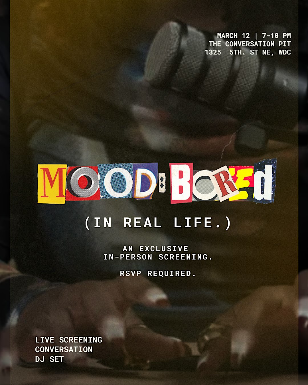 by admin05Mar Mood / Bored: In Real Life at 1325 5th St NE suite g2 – Washington, DC Mood / Bored: In Real Life at 1325 5th St NE suite g2 – Washington, DC 1 1 people viewed this event. A live Mood / Bored screening with conversation and a DJ set. Half memoir, half cultural analysis. Culture in real time. Tickets-RSVP Link Date And Time Thursday, March 12th, 2026 07:00 PM (PST) Venue 1325 5th St NE suite g2 Location 1325 5th Street Northeast, Washington, DC 20002 Event Types Film, Media & EntertainmentParty or Social Gathering Event Category Washington DC Share With Friends Facebook Twitter Linkedin Xing Pinterest Share This Post: