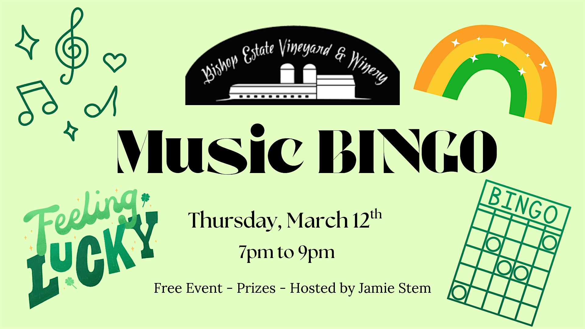 by admin27Feb Music BINGO with Jamie Stem at Bishop Estate Vineyard & Winery at Bishop Estate Vineyard and Winery – Perkasie, PA Music BINGO with Jamie Stem at Bishop Estate Vineyard & Winery at Bishop Estate Vineyard and Winery – Perkasie, PA 1 1 people viewed this event. Come play Music BINGO with Jamie Stem! It’s like regular BINGO, but instead of numbers, we use songs – fun guaranteed! Tickets-RSVP Link Date And Time Thursday, March 12th, 2026 07:00 PM (PST) Venue Bishop Estate Vineyard and Winery Location 2730 Hilltown Pike, Perkasie, PA 18944 Event Types Food & Drink Event Category Pennsylvania Share With Friends Facebook Twitter Linkedin Xing Pinterest Share This Post:
