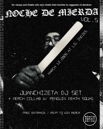 Montgomery Drive PresentsNOCHE DE MIERDA vol 5for vamps and freaks who also shake their booties to reggaeton & dembowft JUANCHIZETA DJ SETMerch Collab w/ Penguin Death SquadThursday, February 12th, 2026Lil Indies – Orlando, FL9PM