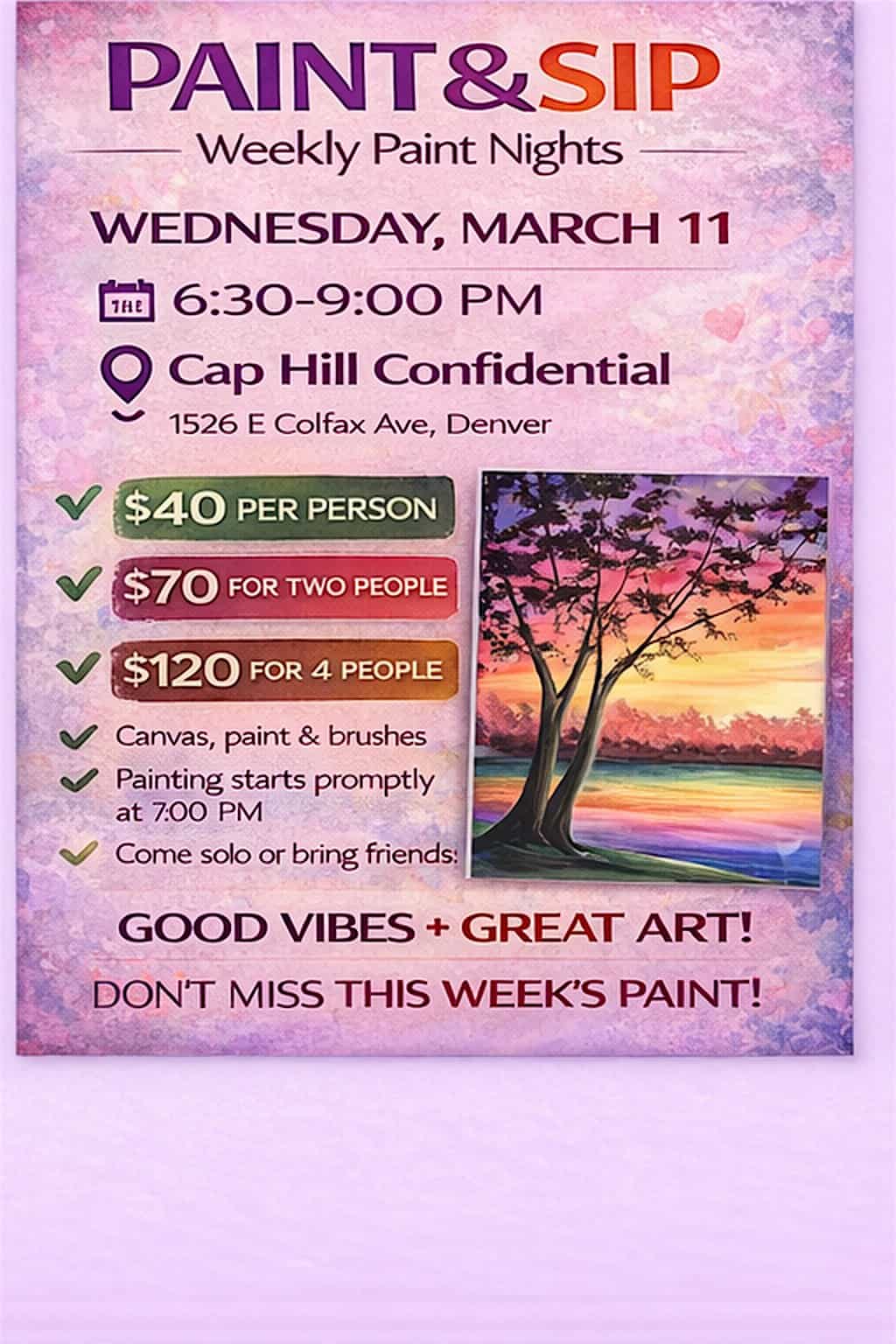 by admin14Feb Paint & Sip: Rainbow Sea at Cap Hill Confidential – Denver, CO Paint & Sip: Rainbow Sea at Cap Hill Confidential – Denver, CO 2 2 people viewed this event. Paint & Sip ✨ Wed Mar 11 | 6:30–9PM (paint @7) Cap Hill Confidential $40 pp | $70/2 | $120/4 No exp needed. Tickets-RSVP Link Date And Time Thursday, March 12th, 2026 12:00 AM (PST) Venue Cap Hill Confidential Location 1526 East Colfax Avenue, Denver, CO 80218 Event Types Food & Drink Event Category ColoradoDenver Share With Friends Facebook Twitter Linkedin Xing Pinterest Share This Post: