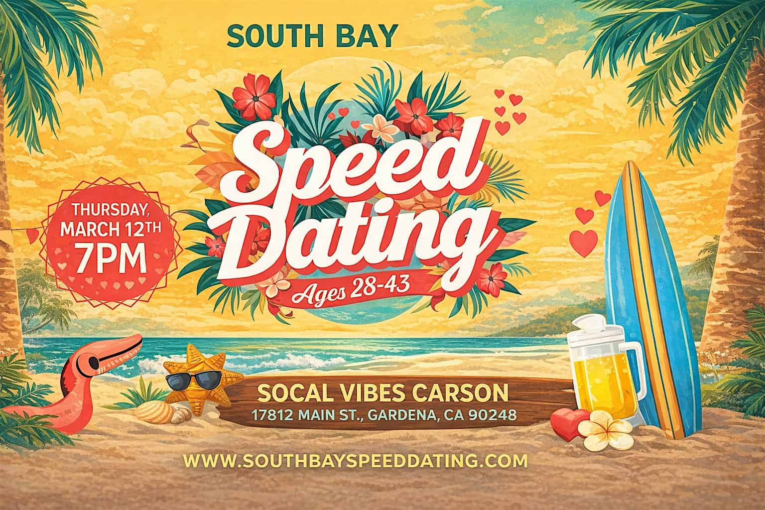 by admin23Feb Speed Dating (Ages 28-43) | South Bay at SoCal Vibes Co. – Brewery, Tasting Room & Kitchen – Gardena, CA Speed Dating (Ages 28-43) | South Bay at SoCal Vibes Co. – Brewery, Tasting Room & Kitchen – Gardena, CA 3 3 people viewed this event. Meet fun, local singles (ages 28–43) at South Bay’s hottest speed dating night — because great connections deserve SoCal vibes. Tickets-RSVP Link Date And Time Thursday, March 12th, 2026 07:00 PM (PST) Venue SoCal Vibes Co. - Brewery, Tasting Room & Kitchen Location 17812 Main Street, Gardena, CA 90248 Event Types Party or Social Gathering Event Category California Share With Friends Facebook Twitter Linkedin Xing Pinterest Share This Post: