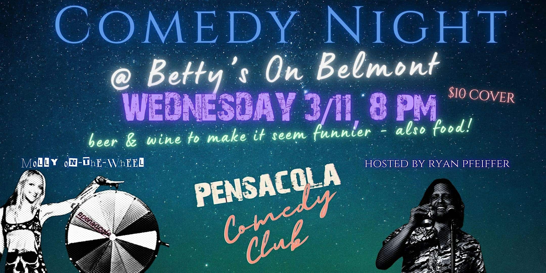 by admin14Feb Stand-Up Comedy Night at Betty’s On Belmont Hosted by Ryan Pfeiffer at 506 W Belmont St – Pensacola, FL Stand-Up Comedy Night at Betty’s On Belmont Hosted by Ryan Pfeiffer at 506 W Belmont St – Pensacola, FL 3 3 people viewed this event. Comedian Ryan Pfeiffer hosts a stand-up comedy showcase at a beautiful venue in historic downtown Pensacola – beer, wine & delicious food! Tickets-RSVP Link Date And Time Thursday, March 12th, 2026 01:00 AM (PST) Venue 506 W Belmont St Location 506 West Belmont Street, Pensacola, FL 32501 Event Types Concert or PerformancePerforming & Visual Arts Event Category FloridaPensacola Share With Friends Facebook Twitter Linkedin Xing Pinterest Share This Post: