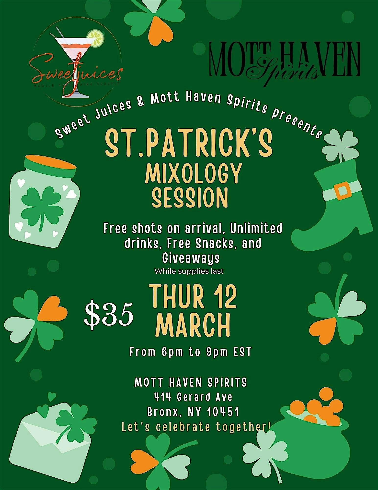 by admin23Feb Sweet Juices & Mott Haven Spirits St Patrick’s Mixology Session at Mott Haven Spirits – The Bronx, NY Sweet Juices & Mott Haven Spirits St Patrick’s Mixology Session at Mott Haven Spirits – The Bronx, NY 3 3 people viewed this event. Join us in Mott Haven for a fun St. Patty’s mixology session with sweet drinks, good music and lively vibes! Tickets-RSVP Link Date And Time Thursday, March 12th, 2026 06:00 PM (PST) Venue Mott Haven Spirits Location 414 Gerard Avenue, The Bronx, NY 10451 Event Types Food & Drink Event Category New YorkNew York City Share With Friends Facebook Twitter Linkedin Xing Pinterest Share This Post: