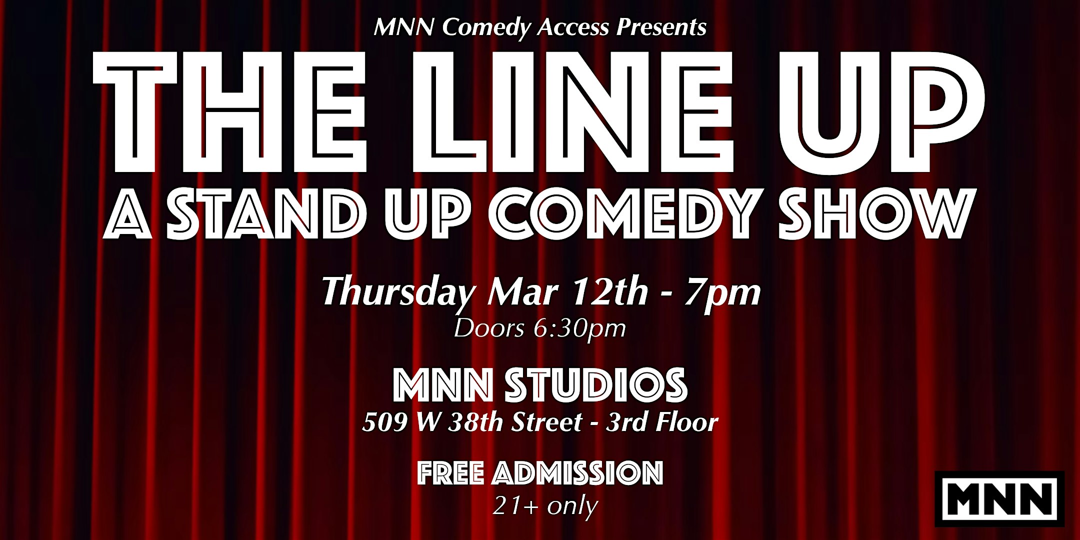 by admin05Mar The Line Up: A Stand-up Comedy Show at Manhattan Neighborhood Network (MNN) – New York, NY The Line Up: A Stand-up Comedy Show at Manhattan Neighborhood Network (MNN) – New York, NY 2 2 people viewed this event. A brand new monthly stand-up comedy showcase featuring some of NYC’s brightest and funniest comics performing live at MNN’s studios. Tickets-RSVP Link Date And Time Thursday, March 12th, 2026 07:00 PM (PST) Venue Manhattan Neighborhood Network (MNN) Location 509 West 38th Street, New York, NY 10018 Event Types Concert or PerformancePerforming & Visual Arts Event Category New YorkNew York City Share With Friends Facebook Twitter Linkedin Xing Pinterest Share This Post:
