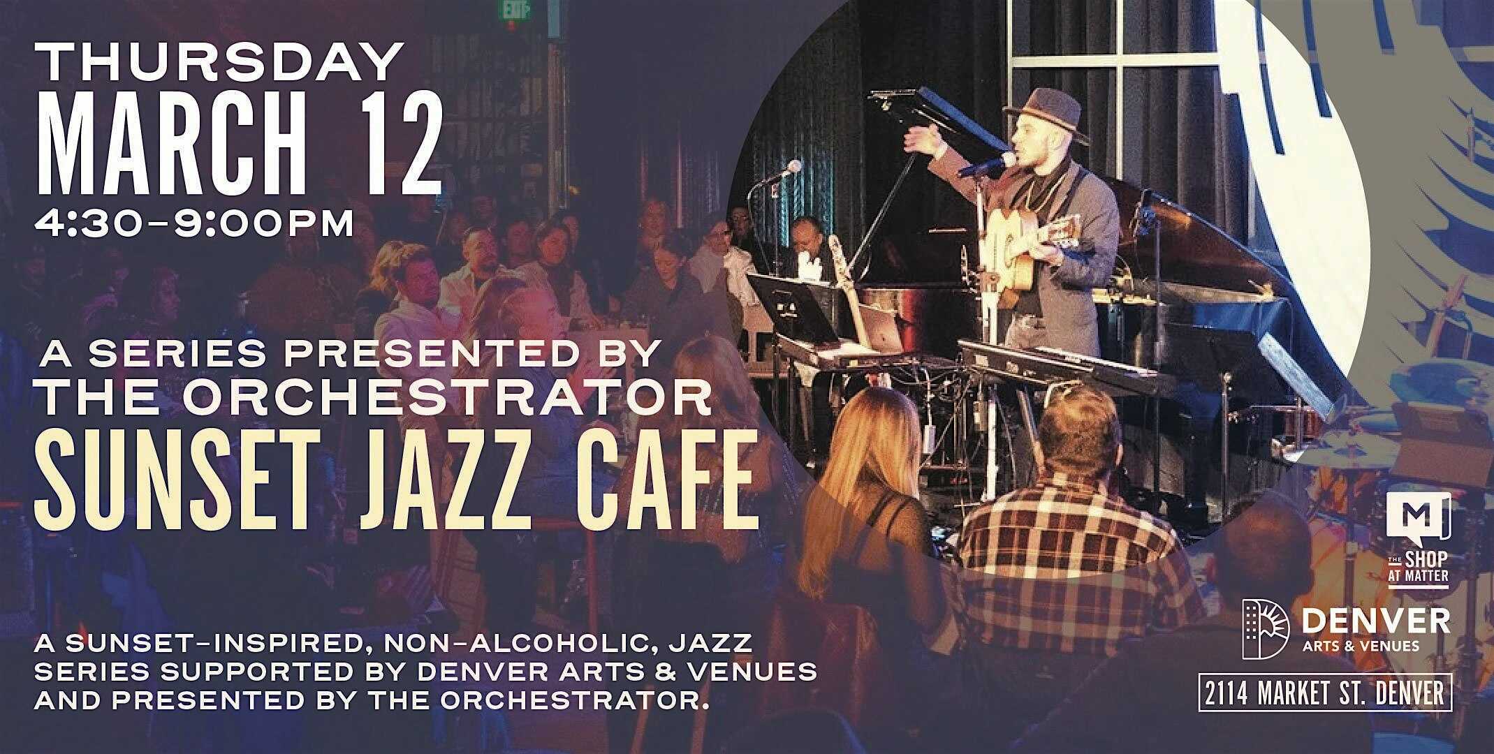 by admin23Feb The Orchestrator Presents: Sunset Jazz Cafe at The Shop at MATTER – Denver, CO The Orchestrator Presents: Sunset Jazz Cafe at The Shop at MATTER – Denver, CO 1 1 people viewed this event. Join us for a sunset-inspired, non-alcoholic, jazz series supported by Denver Arts & Venues and presented by The Orchestrator. Tickets-RSVP Link Date And Time Thursday, March 12th, 2026 06:00 PM (PST) Venue The Shop at MATTER Location 2114 Market Street, Denver, CO 80205 Event Types Concert or PerformanceMusic Event Category ColoradoDenver Share With Friends Facebook Twitter Linkedin Xing Pinterest Share This Post: