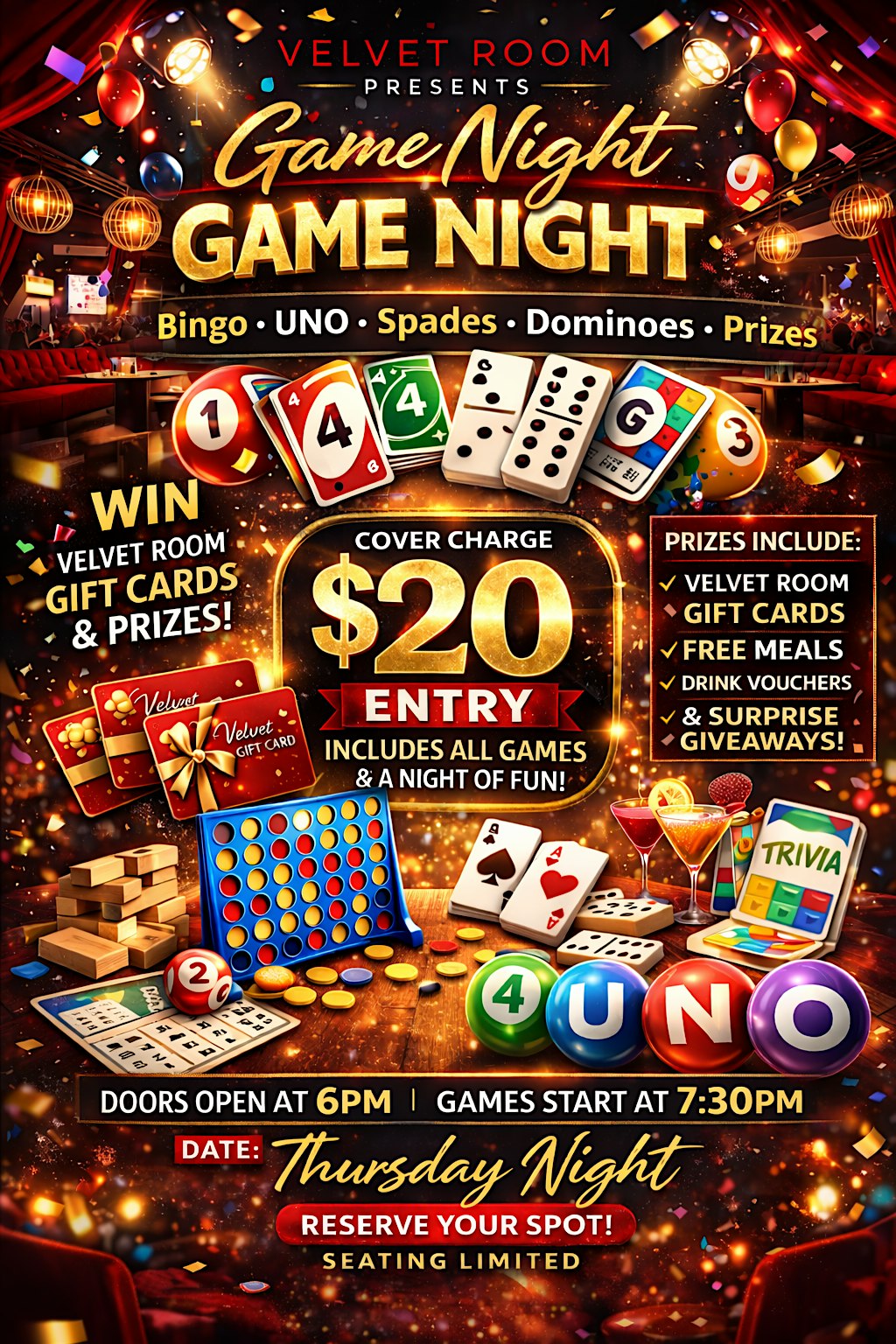 by admin27Feb Velvet Room Game Night – Bingo, UNO, Spades & Prizes at Velvet Room – Jonesboro, GA Velvet Room Game Night – Bingo, UNO, Spades & Prizes at Velvet Room – Jonesboro, GA 2 2 people viewed this event. Join us every Thursday for Game Night at Velvet Room. Bingo, UNO, Spades, Dominoes, prizes, food, and great vibes. Tickets-RSVP Link Date And Time Thursday, March 12th, 2026 07:00 PM (PST) Venue Velvet Room Location 1544 Tara Road, Jonesboro, GA 30238 Event Types Food & DrinkParty or Social Gathering Event Category Georgia Share With Friends Facebook Twitter Linkedin Xing Pinterest Share This Post: