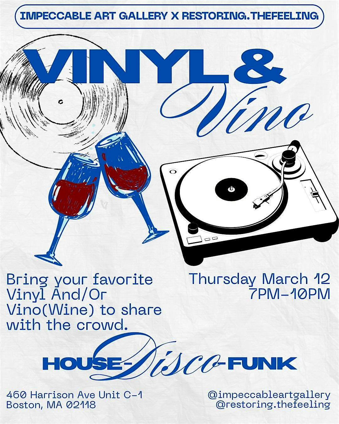 by admin05Mar VINYL & VINO @ Impeccable Art Gallery at Impeccable Art Gallery – Boston, MA VINYL & VINO @ Impeccable Art Gallery at Impeccable Art Gallery – Boston, MA 1 1 people viewed this event. VINYL & VINO: Guests are invited to spin a 10–15 minute vinyl set paired with their favorite bottle of wine to share with the crowd. Tickets-RSVP Link Date And Time Thursday, March 12th, 2026 07:00 PM (PST) Venue Impeccable Art Gallery Location 460 Harrison Avenue, Boston, MA 2118 Event Types MusicParty or Social Gathering Event Category BostonMassachusetts Share With Friends Facebook Twitter Linkedin Xing Pinterest Share This Post: