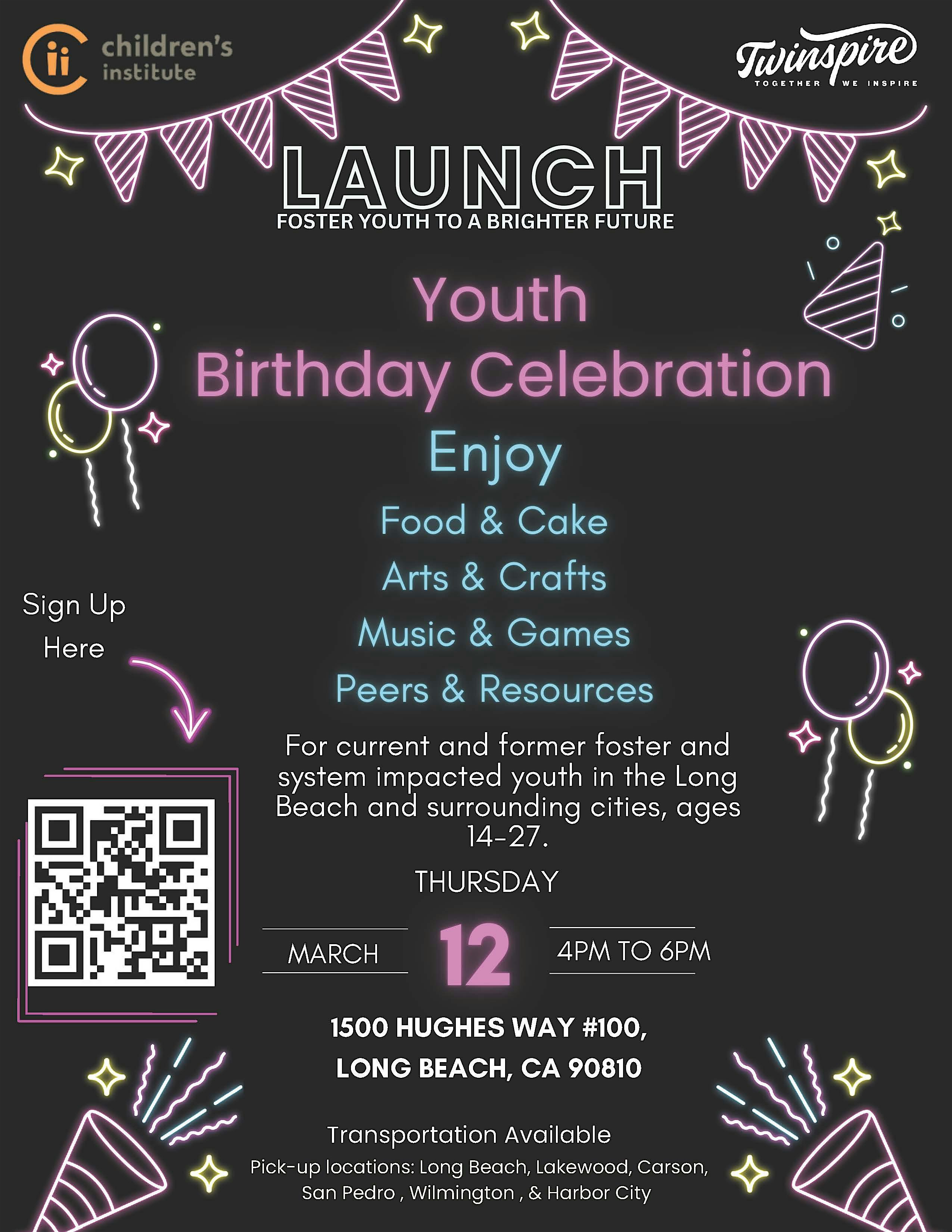 by admin27Feb Youth Birthday Celebration at Children’s Institute, Inc. – Long Beach, CA Youth Birthday Celebration at Children’s Institute, Inc. – Long Beach, CA 1 1 people viewed this event. For current and former foster and system impacted youth in the Long Beach and surrounding cities, ages 14-27. Tickets-RSVP Link Date And Time Thursday, March 12th, 2026 @ 04:00 PM Location 1500 Hughes Way, Long Beach, CA 90810 Event Types Party or Social GatheringSeasonal & Holiday Event Category CaliforniaLong Beach Share With Friends Facebook Twitter Linkedin Xing Pinterest Share This Post: