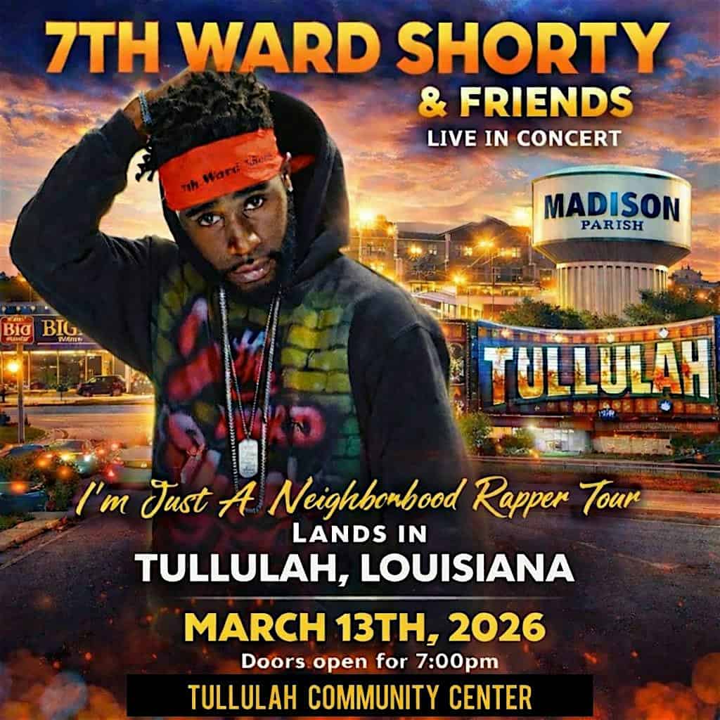 by admin14Feb 7TH WARD SHORTY LIVE @ TULLULAH COMMUNITY CENTER at Tallulah Community Center – Tallulah, LA 7TH WARD SHORTY LIVE @ TULLULAH COMMUNITY CENTER at Tallulah Community Center – Tallulah, LA 2 2 people viewed this event. I’M JUST A NEIGHBORHOOD RAPPER TOUR featuring KEVA HOLIDAY, LASPLIFF, 1KCHAZZ, NSD BRYANT, NOLIA BOI ZACK Tickets-RSVP Link Date And Time Friday, March 13th, 2026 11:00 PM (PST) Venue Tallulah Community Center Location 800 North Beech Street, Tallulah, LA 71282 Event Types Concert or PerformancePerforming & Visual Arts Event Category Louisiana Share With Friends Facebook Twitter Linkedin Xing Pinterest Share This Post:
