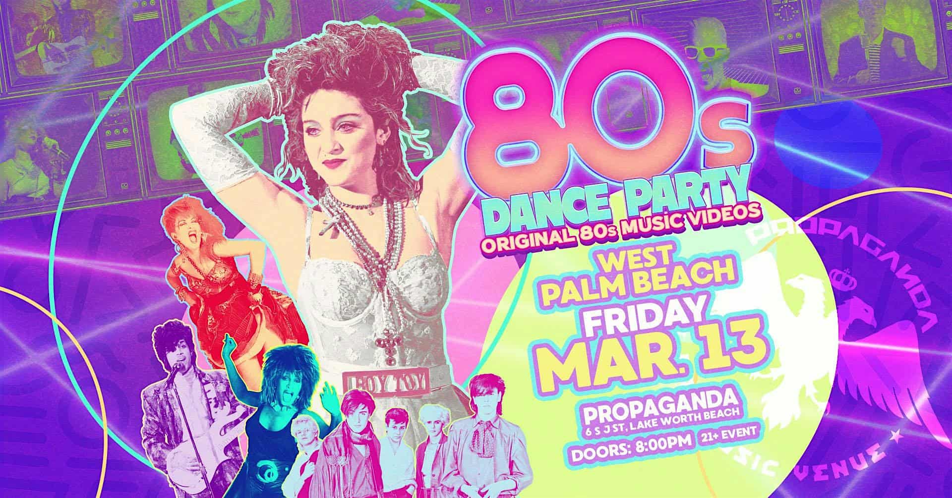 by admin23Feb 80s Dance Party West Palm Beach! at Propaganda – Lake Worth Beach, FL 80s Dance Party West Palm Beach! at Propaganda – Lake Worth Beach, FL 1 1 people viewed this event. 80s Dance Party with DJ Brian St.Clair is at Propaganda on Fri, Mar 13th! Dress in your best ’80s outfits & take a journey back in time! Tickets-RSVP Link Date And Time Friday, March 13th, 2026 @ 08:00 PM Location 6 South J Street, Lake Worth Beach, FL 33460 Event Types MusicParty or Social Gathering Event Category Florida Share With Friends Facebook Twitter Linkedin Xing Pinterest Share This Post: