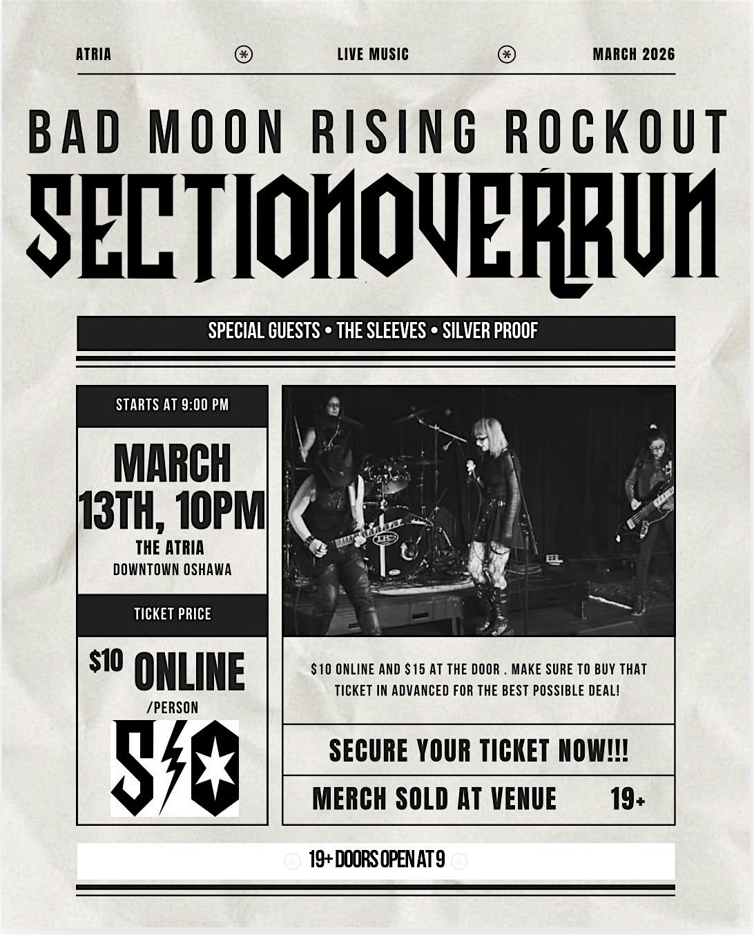 by admin23Feb Bad Moon Rising Rockout at The Atria – Oshawa, Canada Bad Moon Rising Rockout at The Atria – Oshawa, Canada 2 2 people viewed this event. Get ready to rock out with Bad Moon Rising at The Atria, where Section Overrun, Silver Proof, and The Sleeves will blow your mind! Tickets-RSVP Link Date And Time Friday, March 13th, 2026 10:00 PM (PST) Venue The Atria Location 59 King St E Main Floor, Oshawa, Canada L1H 1B2 Event Types Concert or PerformanceMusic Event Category Canada Share With Friends Facebook Twitter Linkedin Xing Pinterest Share This Post: