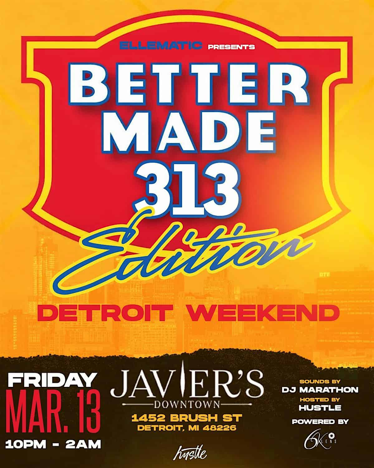 by admin23Feb BETTER MADE at Javier’s Downtown – Detroit, MI BETTER MADE at Javier’s Downtown – Detroit, MI 2 2 people viewed this event. Ellematic, 6kLens, & CHRIS Presents a night to remember featuring Detroits heavy hitters and tastemakers. Cheers to history in the making! Tickets-RSVP Link Date And Time Friday, March 13th, 2026 10:00 PM (PST) Venue Javier’s Downtown Location 1452 Brush Street, Detroit, MI 48226 Event Types Food & DrinkParty or Social Gathering Event Category DetroitMichigan Share With Friends Facebook Twitter Linkedin Xing Pinterest Share This Post: