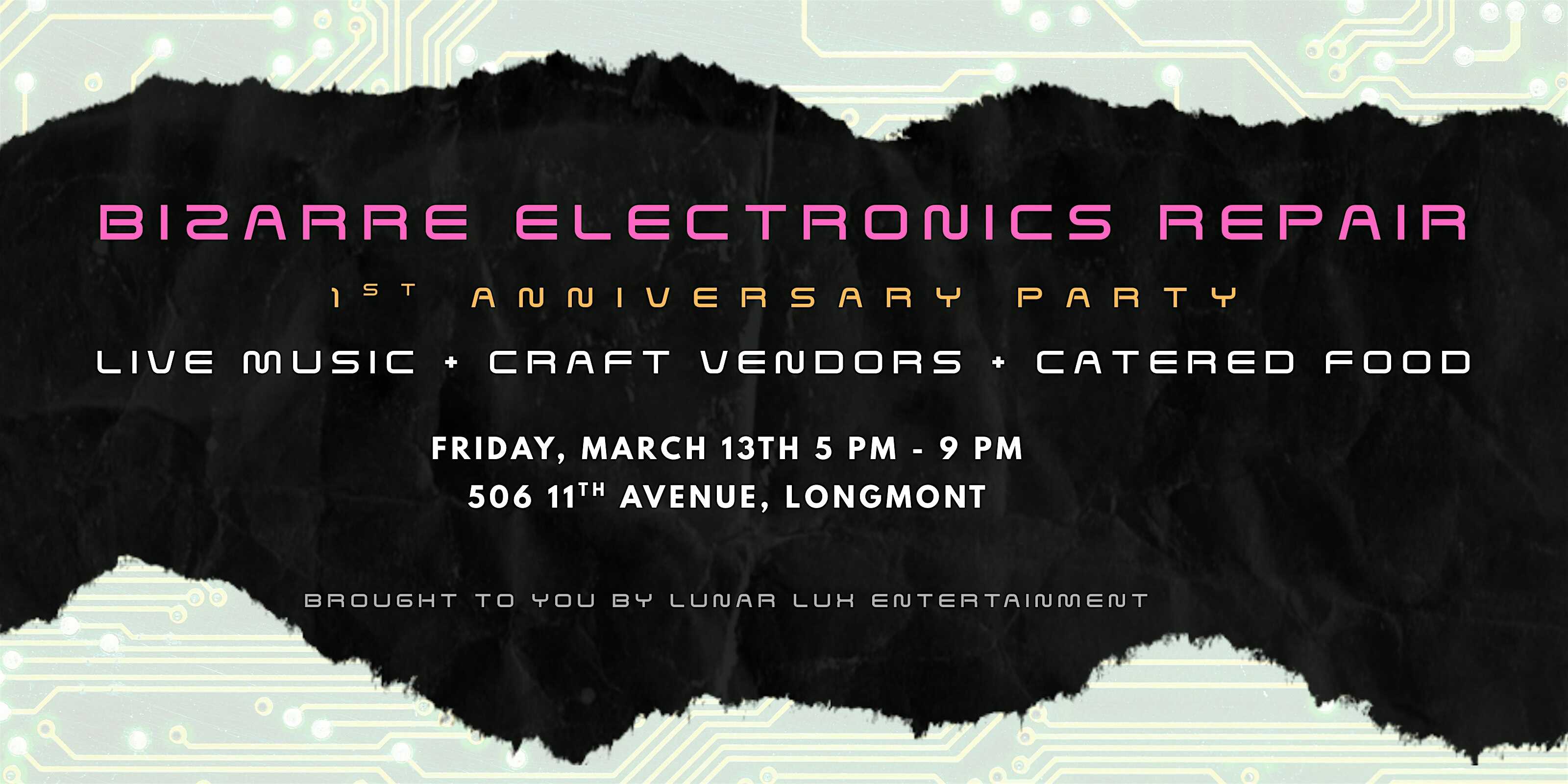 by admin23Feb Bizarre Electronics Anniversary Party & Clothing Drive at Bizarre Electronics Repair – Longmont, CO Bizarre Electronics Anniversary Party & Clothing Drive at Bizarre Electronics Repair – Longmont, CO 1 1 people viewed this event. Join us in celebrating Bizarre Electronics Repair’s anniversary, and help those in need by donating articles of clothing! Tickets-RSVP Link Date And Time Friday, March 13th, 2026 @ 05:00 PM Location 506 11th Avenue, Longmont, CO 80501 Event Types MusicParty or Social Gathering Event Category BoulderColorado Share With Friends Facebook Twitter Linkedin Xing Pinterest Share This Post: