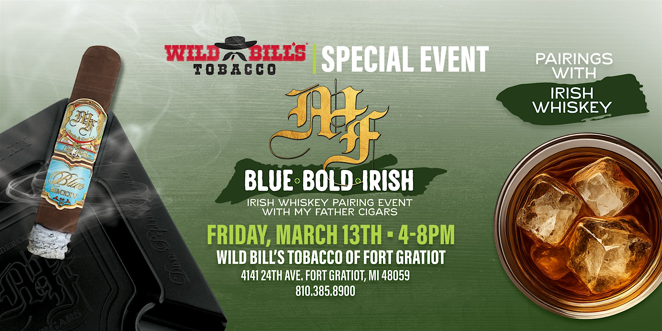 by admin27Feb Blue, Bold, and Irish with My Father Cigars at Wild Bill’s Tobacco – Fort Gratiot Township, MI Blue, Bold, and Irish with My Father Cigars at Wild Bill’s Tobacco – Fort Gratiot Township, MI 1 1 people viewed this event. Join Wild Bill’s as we enjoy a special event featuring My Father Cigars where we pair Irish Whiskey and celebrate the release of the Blue! Tickets-RSVP Link Date And Time Friday, March 13th, 2026 04:00 PM (PST) Venue Wild Bill's Tobacco Location 4141 24th Avenue, Fort Gratiot Township, MI 48059 Event Types Food & DrinkParty or Social Gathering Event Category Michigan Share With Friends Facebook Twitter Linkedin Xing Pinterest Share This Post: