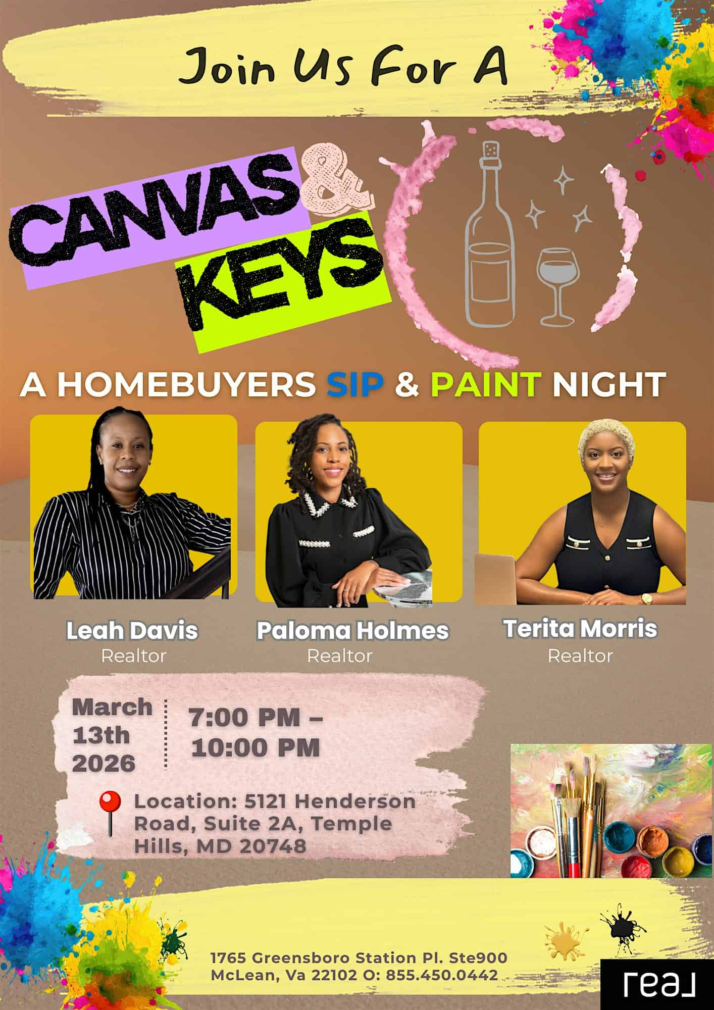 by admin14Feb Canvas & Keys: A Homebuyer Sip & Paint Night at 5121 Henderson Rd suite a – Temple Hills, MD Canvas & Keys: A Homebuyer Sip & Paint Night at 5121 Henderson Rd suite a – Temple Hills, MD 3 3 people viewed this event. Unwind with drinks, paint your dream home, and learn tips to be a homeowner at our fun sip & paint night! Tickets-RSVP Link Date And Time Friday, March 13th, 2026 11:00 PM (PST) Venue 5121 Henderson Rd suite a Location 5121 Henderson Road, Temple Hills, MD 20748 Event Types Food & Drink Event Category MarylandNational Harbor Share With Friends Facebook Twitter Linkedin Xing Pinterest Share This Post: