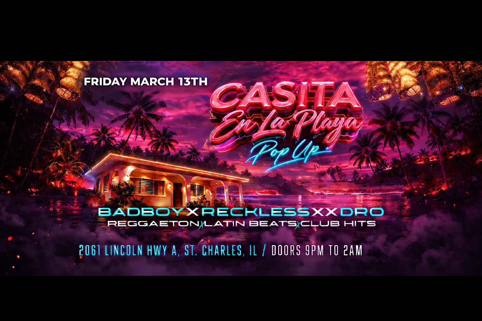by admin27Feb CASITA EN LA PLAYA POP UP at Playa | Bar & Music Lounge – St. Charles, IL CASITA EN LA PLAYA POP UP at Playa | Bar & Music Lounge – St. Charles, IL 1 1 people viewed this event. La Casita Pop Up at La Playa is bringing the ultimate reggaetón experience to life. Tickets-RSVP Link Date And Time Friday, March 13th, 2026 @ 09:00 PM Location 2061 Lincoln Highway, St. Charles, IL 60175 Event Types MusicOther Event Category Illinois Share With Friends Facebook Twitter Linkedin Xing Pinterest Share This Post: