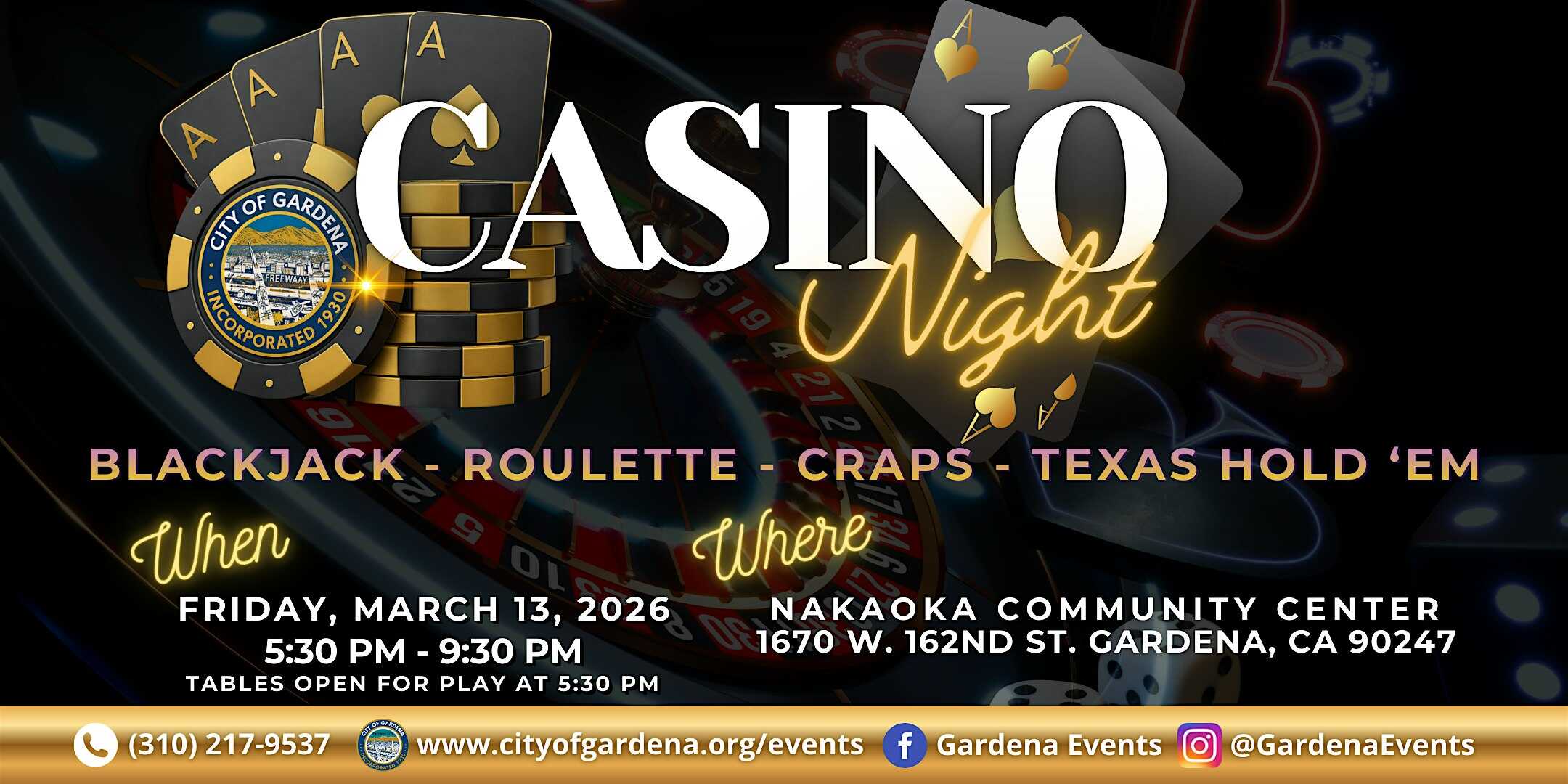 by admin23Feb City of Gardena Casino Night 2026 at Nakaoka Community Center – Gardena, CA City of Gardena Casino Night 2026 at Nakaoka Community Center – Gardena, CA 1 1 people viewed this event. Come enjoy an evening of play with a purpose & win incredible prizes! Tickets-RSVP Link Date And Time Friday, March 13th, 2026 @ 05:00 PM Location 1670 West 162nd Street, Gardena, CA 90247 Event Types Charity & CausesParty or Social Gathering Event Category California Share With Friends Facebook Twitter Linkedin Xing Pinterest Share This Post: