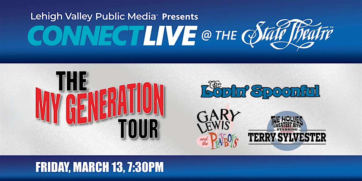 by admin13Feb Connect LIVE at My Generation Concert at State Theatre Center for the Arts – Easton, PA Connect LIVE at My Generation Concert at State Theatre Center for the Arts – Easton, PA 2 2 people viewed this event. Join Lehigh Valley Public Media for a pre-show reception, meet and greet, and concert at the State Theatre! Tickets-RSVP Link Date And Time Friday, March 13th, 2026 10:00 PM (PST) Venue State Theatre Center for the Arts Location 453 Northampton Street, Easton, PA 18042 Event Types Concert or PerformanceMusic Event Category Pennsylvania Share With Friends Facebook Twitter Linkedin Xing Pinterest Share This Post: