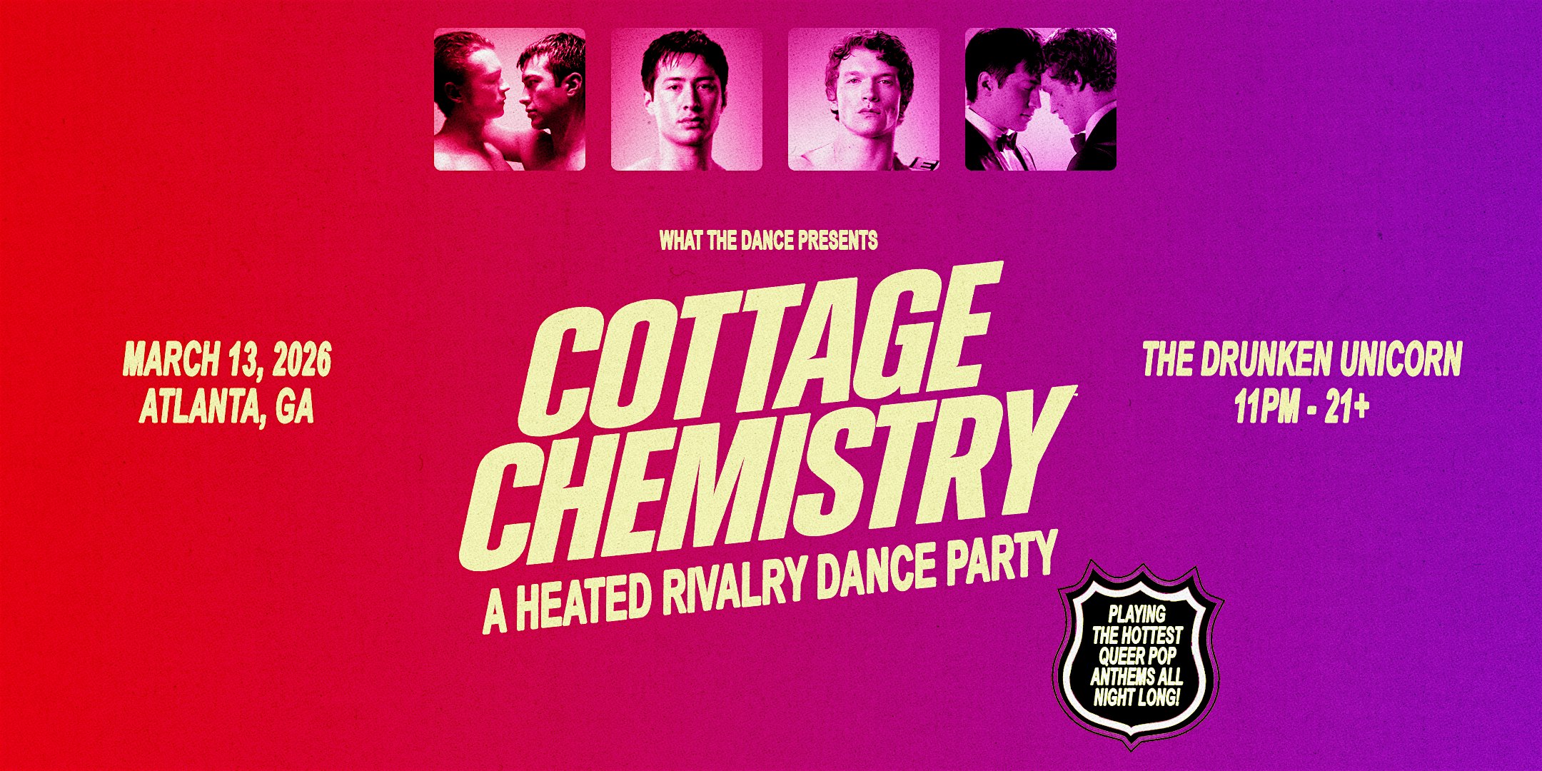 by admin27Feb COTTAGE CHEMISTRY: A HEATED RIVALRY DANCE PARTY – ATLANTA at The Drunken Unicorn – Atlanta, GA COTTAGE CHEMISTRY: A HEATED RIVALRY DANCE PARTY – ATLANTA at The Drunken Unicorn – Atlanta, GA 1 1 people viewed this event. ATLANTA! Come celebrate your favorite TV obsession as we dance to the Heated Rivalry soundtrack and the hottest queer pop anthems! Tickets-RSVP Link Date And Time Friday, March 13th, 2026 @ 11:00 PM Location 736 Ponce De Leon Avenue Northeast, Atlanta, GA 30306 Event Types Party or Social GatheringPerforming & Visual Arts Event Category AtlantaGeorgia Share With Friends Facebook Twitter Linkedin Xing Pinterest Share This Post: