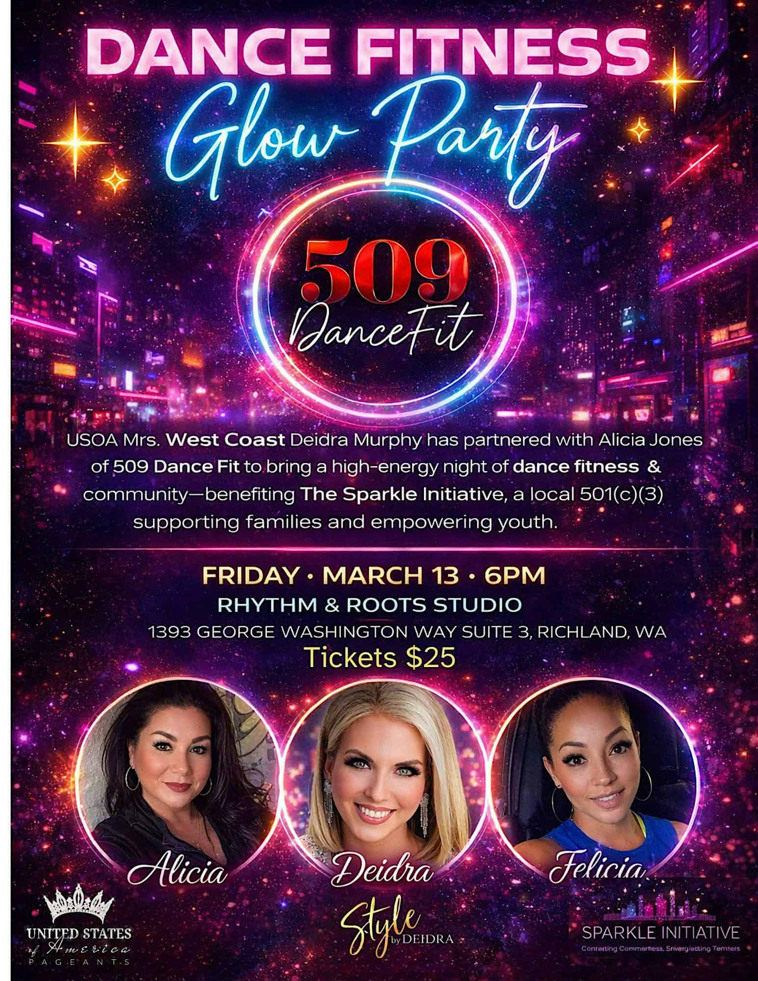 by admin23Feb Dance Fit Glow Party & Fundraiser at Rhythm & Roots TC – Richland, WA Dance Fit Glow Party & Fundraiser at Rhythm & Roots TC – Richland, WA 1 1 people viewed this event. Friday the 13th Dance Glow Party with Deidra & 509 Dance Fit benefiting The Sparkle Initiative. Dance, sweat, and shine. Tickets-RSVP Link Date And Time Friday, March 13th, 2026 @ 06:00 PM Location 1393 George Washington Way, Richland, WA 99354 Event Types Party or Social GatheringSports & Fitness Event Category Washington Share With Friends Facebook Twitter Linkedin Xing Pinterest Share This Post: