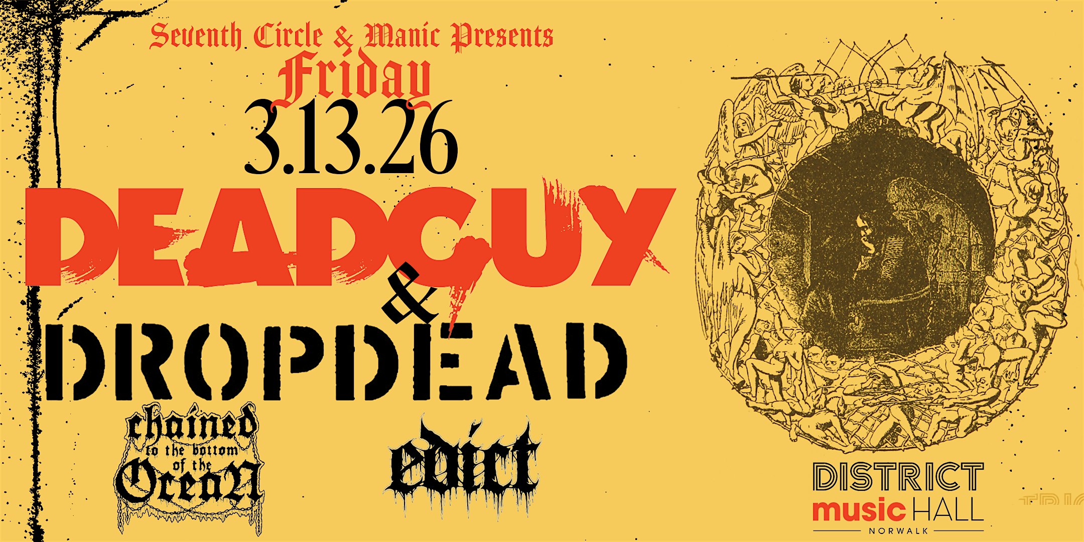 by admin13Feb Deadguy at District Music Hall – Norwalk, CT Deadguy at District Music Hall – Norwalk, CT 2 2 people viewed this event. with Dropdead, Chained to the Bottom of the Ocean, Edict Tickets-RSVP Link Date And Time Friday, March 13th, 2026 11:00 PM (PST) Venue District Music Hall Location 71 Wall Street, Norwalk, CT 6850 Event Types Concert or PerformanceMusic Event Category BridgeportConnecticut Share With Friends Facebook Twitter Linkedin Xing Pinterest Share This Post: