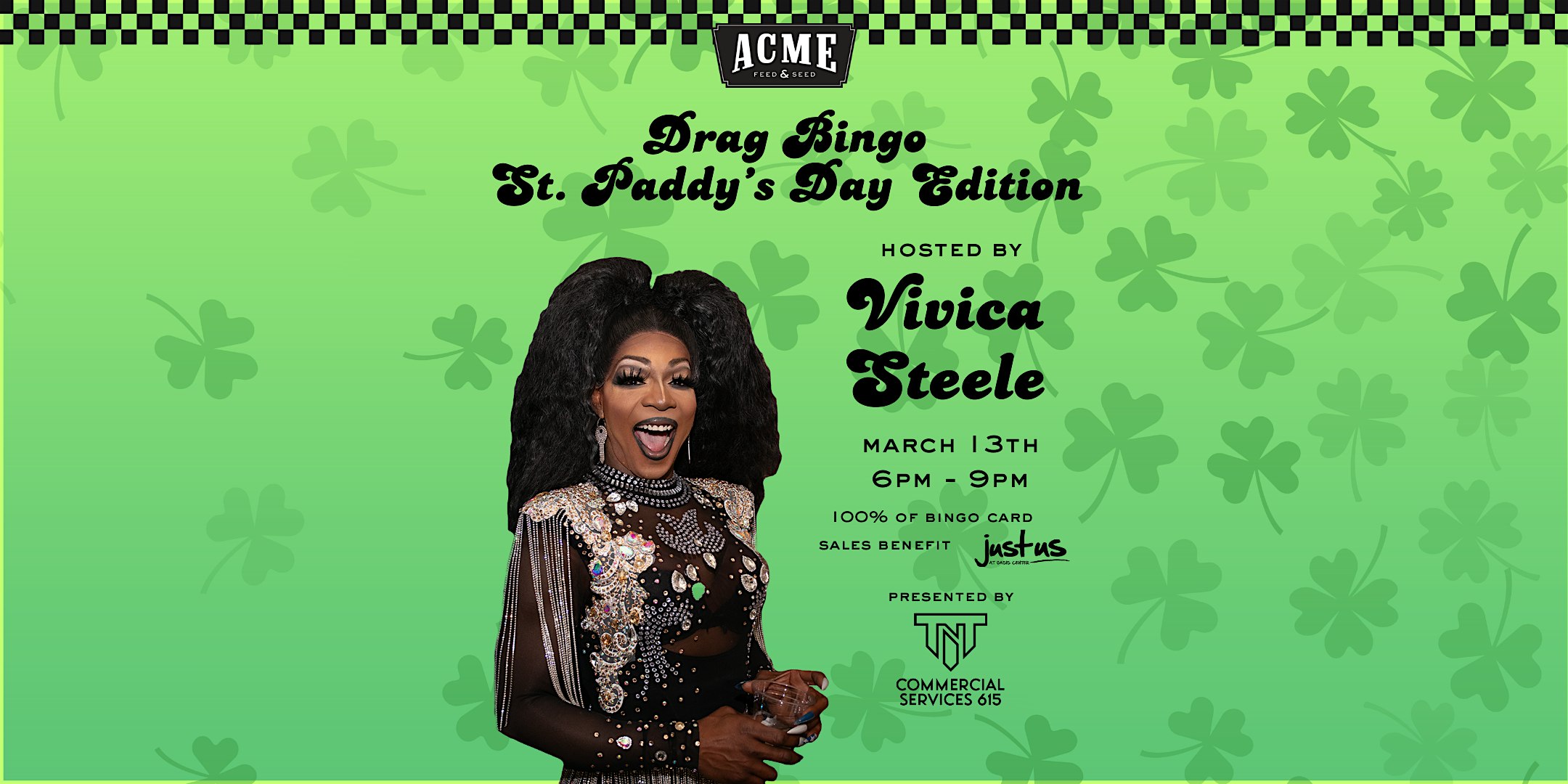 by admin23Feb Drag Bingo, St. Paddy’s Day Edition hosted by Vivica Steele – Downtown at Acme Feed & Seed – Nashville, TN Drag Bingo, St. Paddy’s Day Edition hosted by Vivica Steele – Downtown at Acme Feed & Seed – Nashville, TN 2 2 people viewed this event. Kick off St. Patrick’s Day weekend with Drag Bingo! All bingo card proceeds will go straight to Just Us as Oasis Center! Tickets-RSVP Link Date And Time Friday, March 13th, 2026 06:00 PM (PST) Venue Acme Feed & Seed Location 101 Broadway, Nashville, TN 37201 Event Types Party or Social GatheringSeasonal & Holiday Event Category NashvilleTennessee Share With Friends Facebook Twitter Linkedin Xing Pinterest Share This Post: