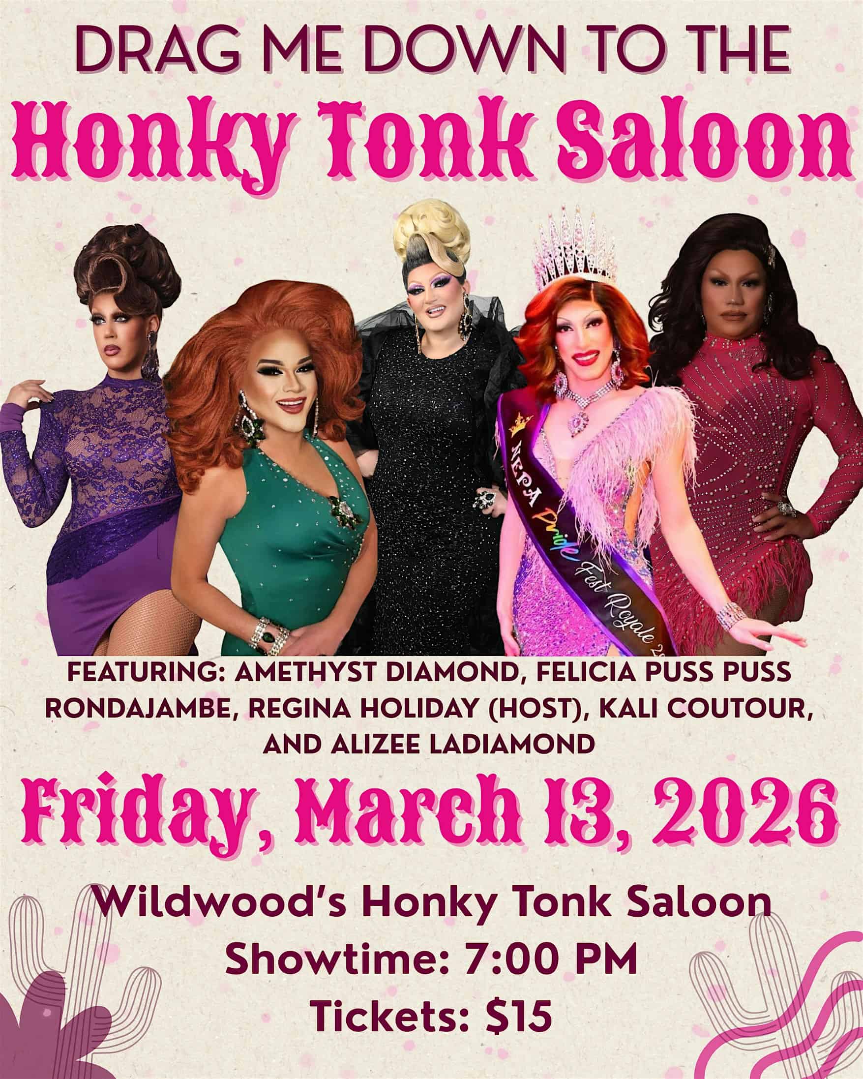 by admin14Feb Drag Me Down To The Honky Tonk Saloon at Wildwood’s Honky Tonk Saloon – Wildwood, NJ Drag Me Down To The Honky Tonk Saloon at Wildwood’s Honky Tonk Saloon – Wildwood, NJ 2 2 people viewed this event. Drag Me Down to the Honky Tonk Saloon is bringing high glam, big hair, and country-flavored chaos to Wildwood’s Honky Tonk Saloon! Tickets-RSVP Link Date And Time Friday, March 13th, 2026 11:00 PM (PST) Venue Wildwood's Honky Tonk Saloon Location 3800 Boardwalk, Wildwood, NJ 8260 Event Types Concert or PerformancePerforming & Visual Arts Event Category New Jersey Share With Friends Facebook Twitter Linkedin Xing Pinterest Share This Post: