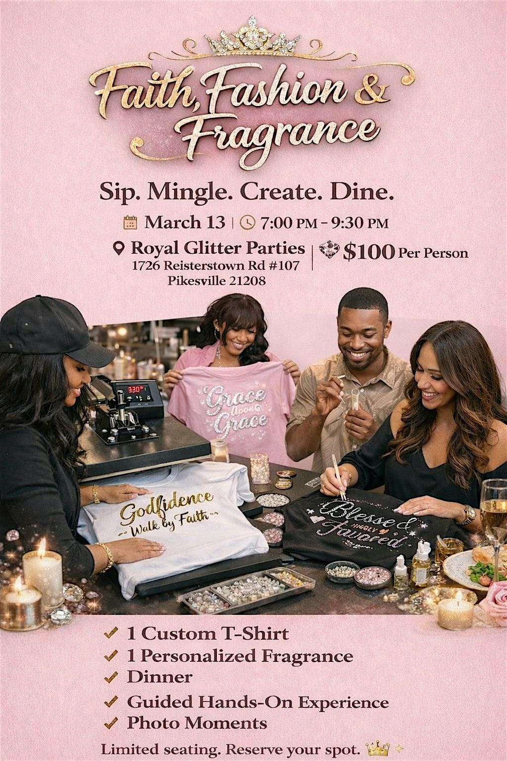 by admin23Feb FAITH, FASHION & FRAGRANCE at ROYAL GLITTER PARTIES – Pikesville, MD FAITH, FASHION & FRAGRANCE at ROYAL GLITTER PARTIES – Pikesville, MD 2 2 people viewed this event. Experience the vibe where faith, style, and scents collide in one epic in-person event! Tickets-RSVP Link Date And Time Friday, March 13th, 2026 @ 07:00 PM Location 1726 Reisterstown Road, Pikesville, MD 21208 Event Types Fashion & BeautyParty or Social Gathering Event Category Maryland Share With Friends Facebook Twitter Linkedin Xing Pinterest Share This Post: