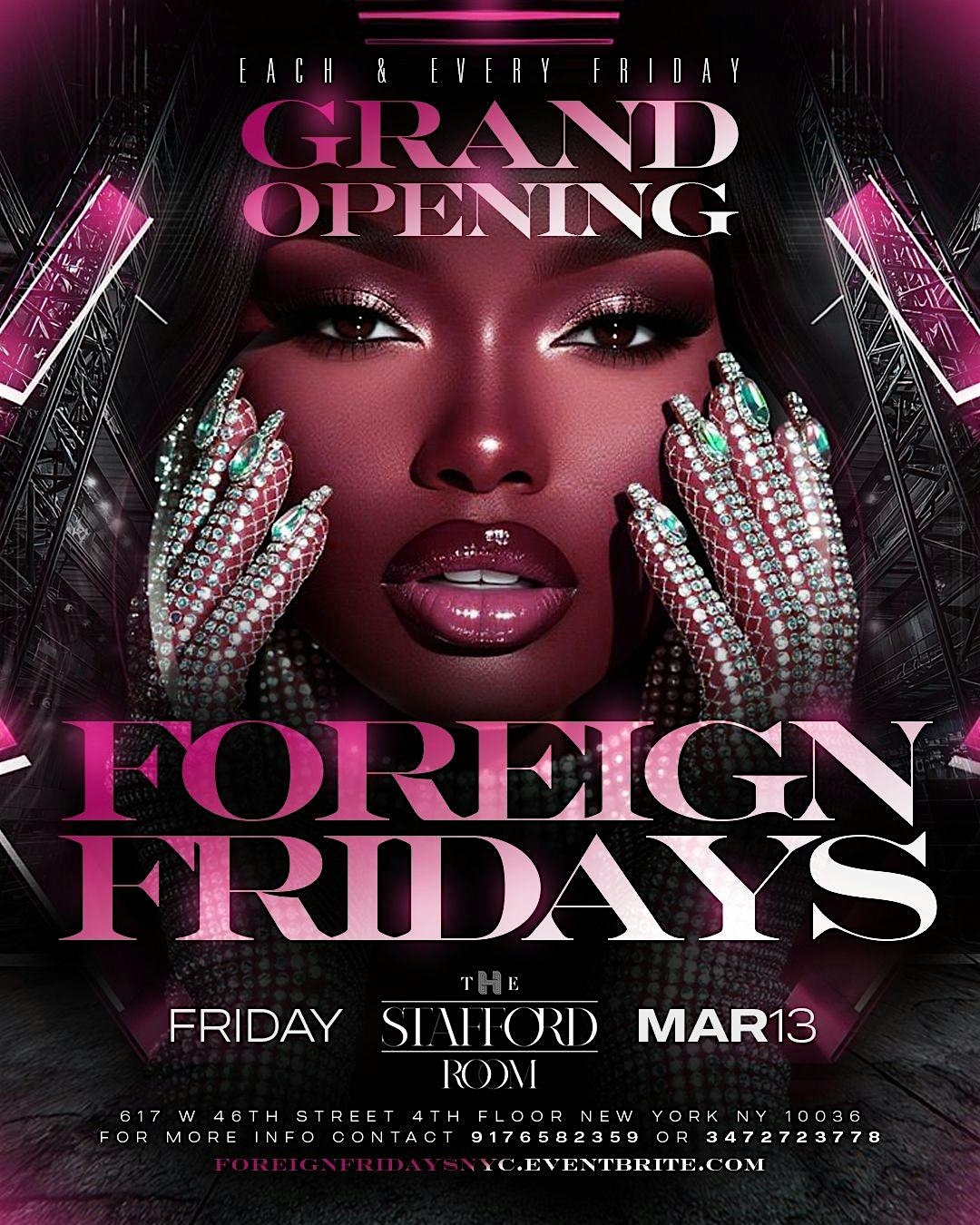 by admin05Mar FOREIGN FRIDAYS NYC “Your turn up destination “ (No cover w/ rsvp) at The Stafford Room – New York, NY FOREIGN FRIDAYS NYC “Your turn up destination “ (No cover w/ rsvp) at The Stafford Room – New York, NY 2 2 people viewed this event. Welcome to Foreign Fridays — NYC’s newest destination nightlife experience. Each week we land in a new country, bringing foreign energy Tickets-RSVP Link Date And Time Friday, March 13th, 2026 10:00 PM (PST) Venue The Stafford Room Location 617 West 46th Street, New York, NY 10036 Event Types MusicParty or Social Gathering Event Category New YorkNew York City Share With Friends Facebook Twitter Linkedin Xing Pinterest Share This Post:
