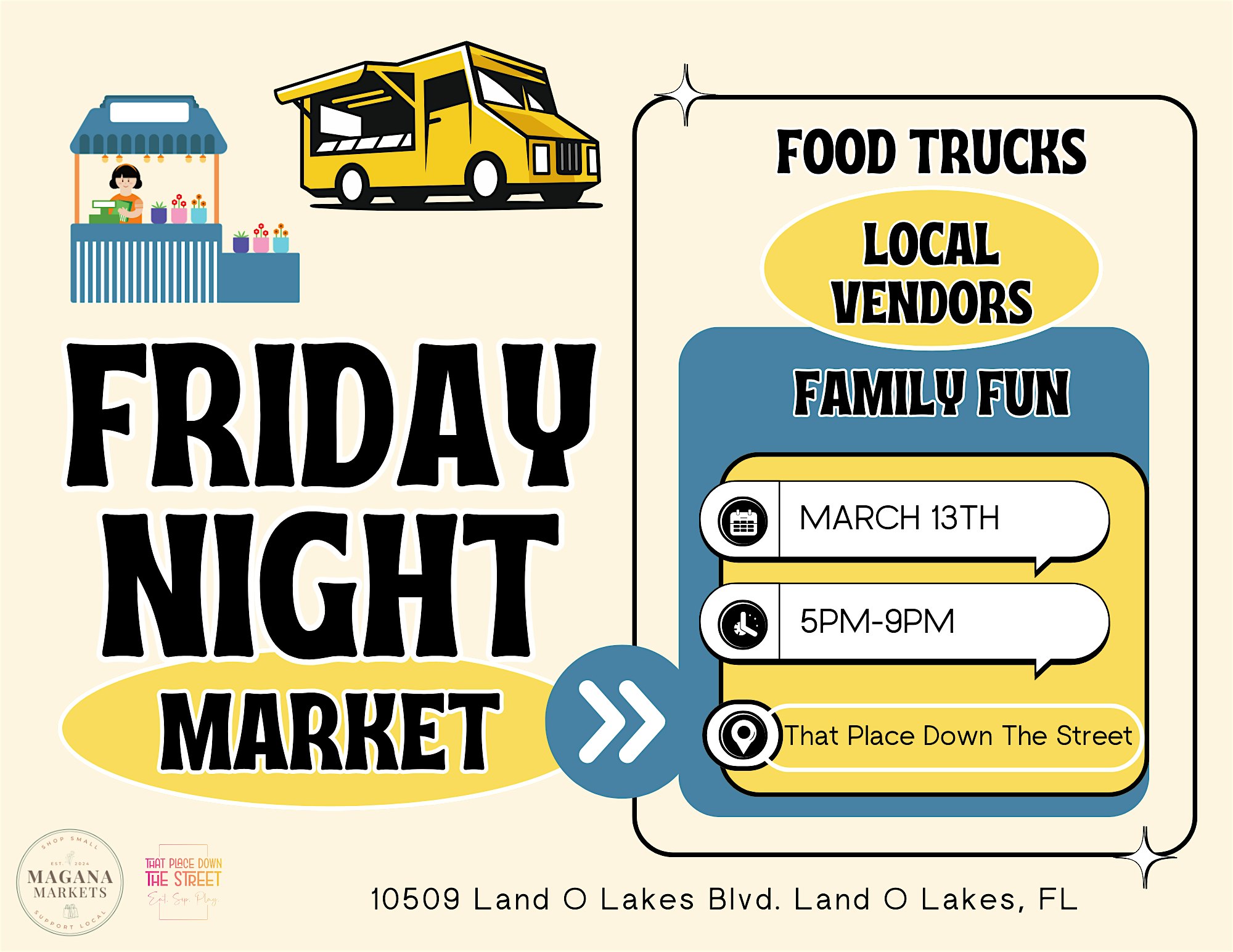 by admin27Feb Friday Night Market at That Place Down The Street – Land O’ Lakes, FL Friday Night Market at That Place Down The Street – Land O’ Lakes, FL 1 1 people viewed this event. A relaxed Friday night experience with great vendors, food, and atmosphere. Tickets-RSVP Link Date And Time Friday, March 13th, 2026 05:00 PM (PST) Venue That Place Down The Street Location 10509 Land O' Lakes Boulevard, Land O' Lakes, FL 34637 Event Types Festival or FairFood & Drink Event Category Florida Share With Friends Facebook Twitter Linkedin Xing Pinterest Share This Post: