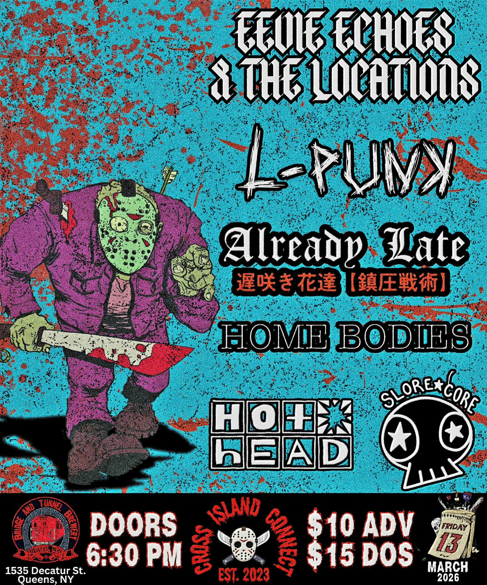 by admin23Feb FRIDAY THE 13TH AT BRIDGE AND TUNNEL at Bridge and Tunnel Brewery – Queens, NY FRIDAY THE 13TH AT BRIDGE AND TUNNEL at Bridge and Tunnel Brewery – Queens, NY 2 2 people viewed this event. EEVIE ECHOES + THE LOCATIONS, L-PUNK, ALREADY LATE, HOME BODIES, MAREKO & THE SLORES, HOT HEAD AT BRIDGE AND TUNNEL Tickets-RSVP Link Date And Time Friday, March 13th, 2026 06:00 PM (PST) Venue Bridge and Tunnel Brewery Location 15-35 Decatur Street, Queens, NY 11385 Event Types Concert or PerformanceMusic Event Category New YorkNew York City Share With Friends Facebook Twitter Linkedin Xing Pinterest Share This Post: