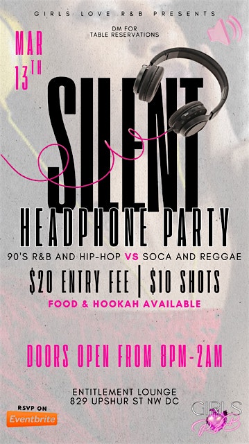 by admin23Feb Girls Love R&B: Silent Headphone Party Edition ✨ at Entitlement Lounge – Washington, DC Girls Love R&B: Silent Headphone Party Edition ✨ at Entitlement Lounge – Washington, DC 1 1 people viewed this event. On March 13th from 8PM–2AM, we’re turning up the heat at Entitlement Lounge for an unforgettable night of music, drinks, and nonstop energy! Tickets-RSVP Link Date And Time Friday, March 13th, 2026 08:00 PM (PST) Venue Entitlement Lounge Location 829 Upshur Street Northwest, Washington, DC 20011 Event Types MusicParty or Social Gathering Event Category Washington DC Share With Friends Facebook Twitter Linkedin Xing Pinterest Share This Post: