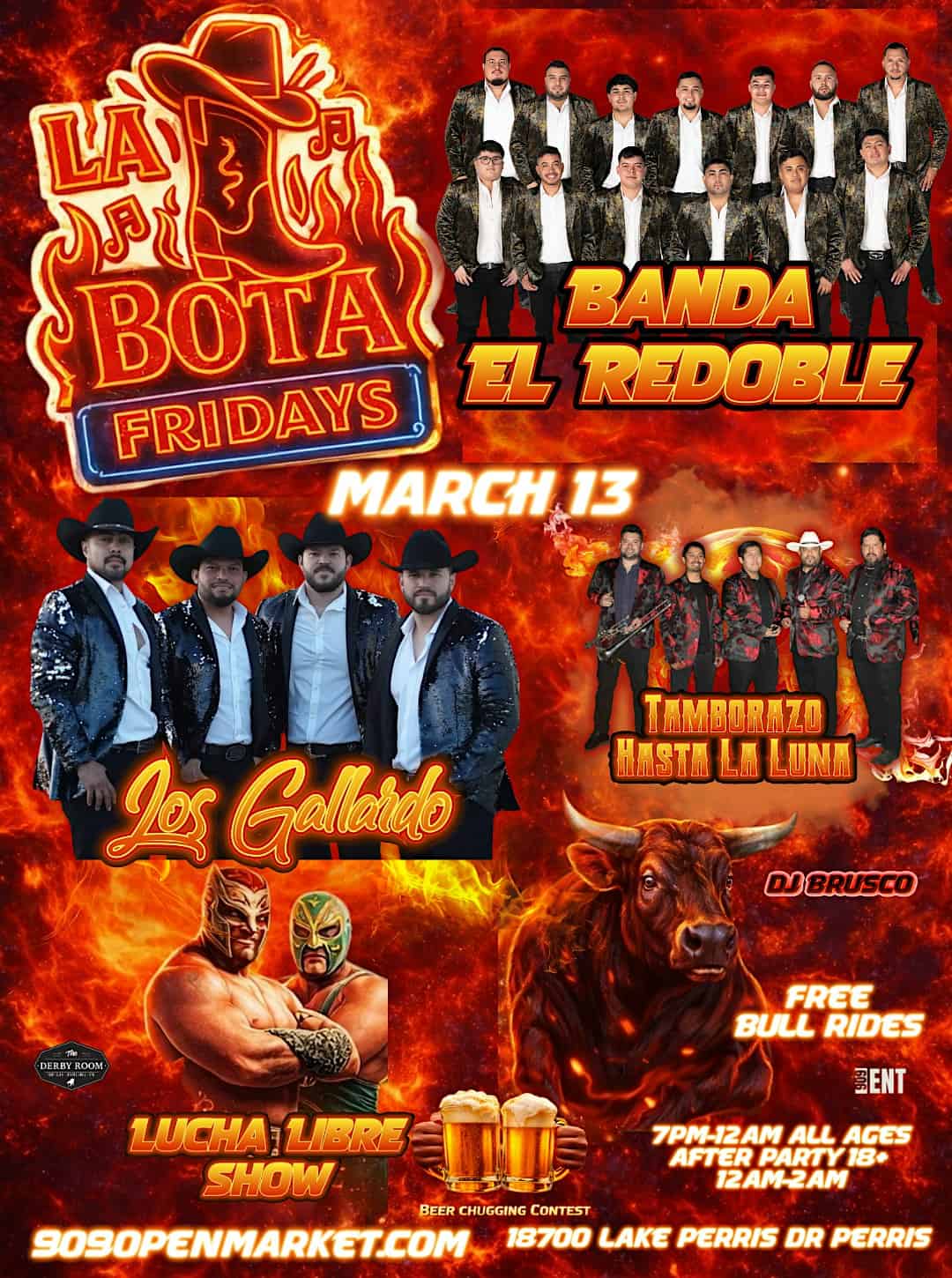 by admin23Feb La Bota Fridays- Perris at 18700 Lake Perris Dr – Perris, CA La Bota Fridays- Perris at 18700 Lake Perris Dr – Perris, CA 1 1 people viewed this event. Ven a La Bota Fridays y pásala bomba con buena música, drinks y vibes en persona. ¡No te lo pierdas! Tickets-RSVP Link Date And Time Friday, March 13th, 2026 07:00 PM (PST) Venue 18700 Lake Perris Dr Location 18700 Lake Perris Drive, Perris, CA 92571 Event Types MusicParty or Social Gathering Event Category California Share With Friends Facebook Twitter Linkedin Xing Pinterest Share This Post: