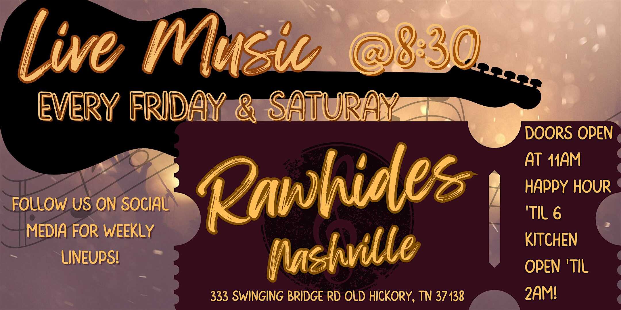 by admin23Feb Live Music! at Rawhides – Nashville, TN Live Music! at Rawhides – Nashville, TN 1 1 people viewed this event. Join us at Rawhides every Friday and Saturday for live bands starting at 8:30pm! Doors open at 11am with happy hour until 6pm! Open til 2am! Tickets-RSVP Link Date And Time Friday, March 13th, 2026 08:00 PM (PST) Venue Rawhides Location 333 Swinging Bridge Road, Nashville, TN 37138 Event Types Concert or PerformanceMusic Event Category NashvilleTennessee Share With Friends Facebook Twitter Linkedin Xing Pinterest Share This Post: