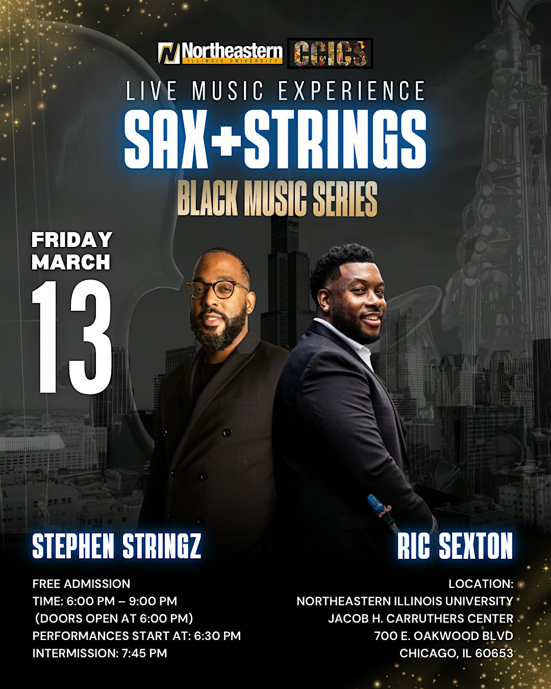 by admin27Feb NEIU CCICS – “Sax + Strings” Black Music Series at Northeastern Illinois University – Chicago, IL NEIU CCICS – “Sax + Strings” Black Music Series at Northeastern Illinois University – Chicago, IL 1 1 people viewed this event. Get ready for a chill night blending smooth sax vibes with soulful strings in the Black Music Series. A ticket is required for this event. Tickets-RSVP Link Date And Time Friday, March 13th, 2026 06:00 PM (PST) Venue Northeastern Illinois University Location 700 East Oakwood Boulevard, Chicago, IL 60653 Event Types Concert or PerformanceMusic Event Category ChicagoIllinois Share With Friends Facebook Twitter Linkedin Xing Pinterest Share This Post: