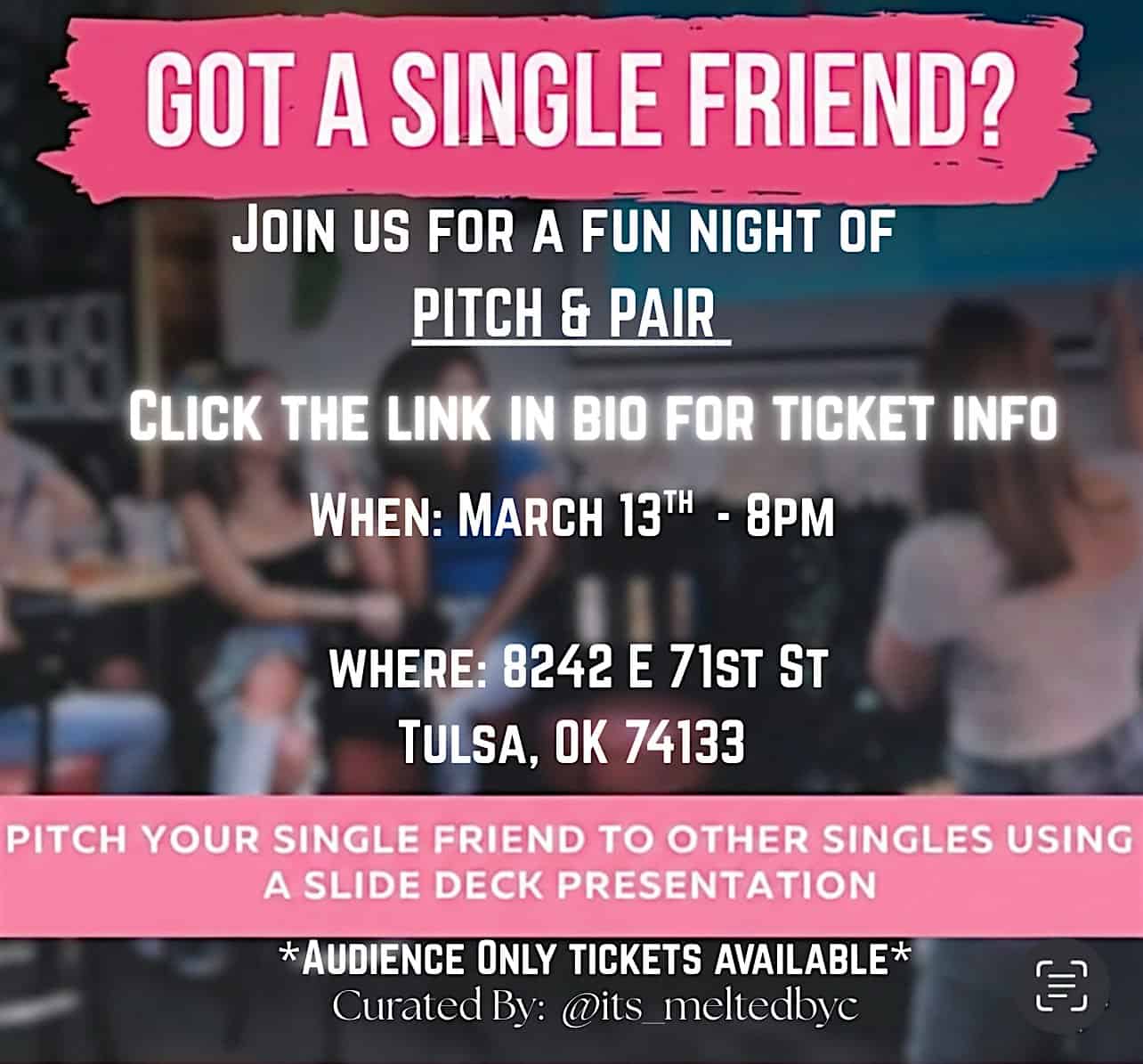 by admin23Feb Pair & Pitch – Tulsa Speed Dating Event at AFRO- FLAVOURZ – Tulsa, OK Pair & Pitch – Tulsa Speed Dating Event at AFRO- FLAVOURZ – Tulsa, OK 2 2 people viewed this event. Have a single friend who’s a catch? Pitch them in a fun slide deck/canva slide to a room of singles. Play matchmaker-spark love. Tickets-RSVP Link Date And Time Friday, March 13th, 2026 @ 08:00 PM Location 8242 East 71st Street, Tulsa, OK 74133 Event Types Community & CultureParty or Social Gathering Event Category OklahomaTulsa Share With Friends Facebook Twitter Linkedin Xing Pinterest Share This Post:
