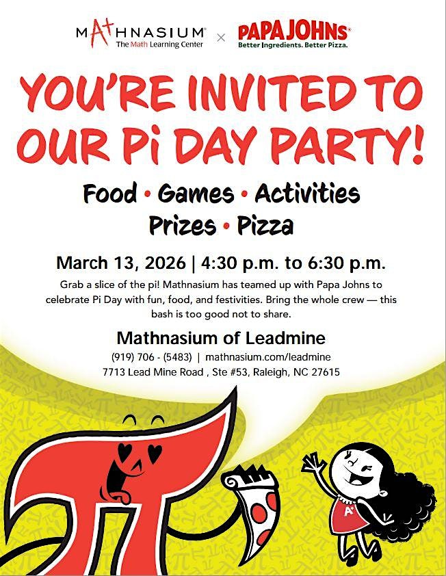 by admin27Feb PI Day Party at 7713 Lead Mine Rd – Raleigh, NC PI Day Party at 7713 Lead Mine Rd – Raleigh, NC 1 1 people viewed this event. Join us at Mathnasium to have fun and enjoy PI Day!! We have games and fun activities that will celebrate PI !! Bring your friends/family! Tickets-RSVP Link Date And Time Friday, March 13th, 2026 @ 04:00 PM Location 7713 Lead Mine Road, Raleigh, NC 27615 Event Types Party or Social Gathering Event Category North CarolinaRaleigh Share With Friends Facebook Twitter Linkedin Xing Pinterest Share This Post: