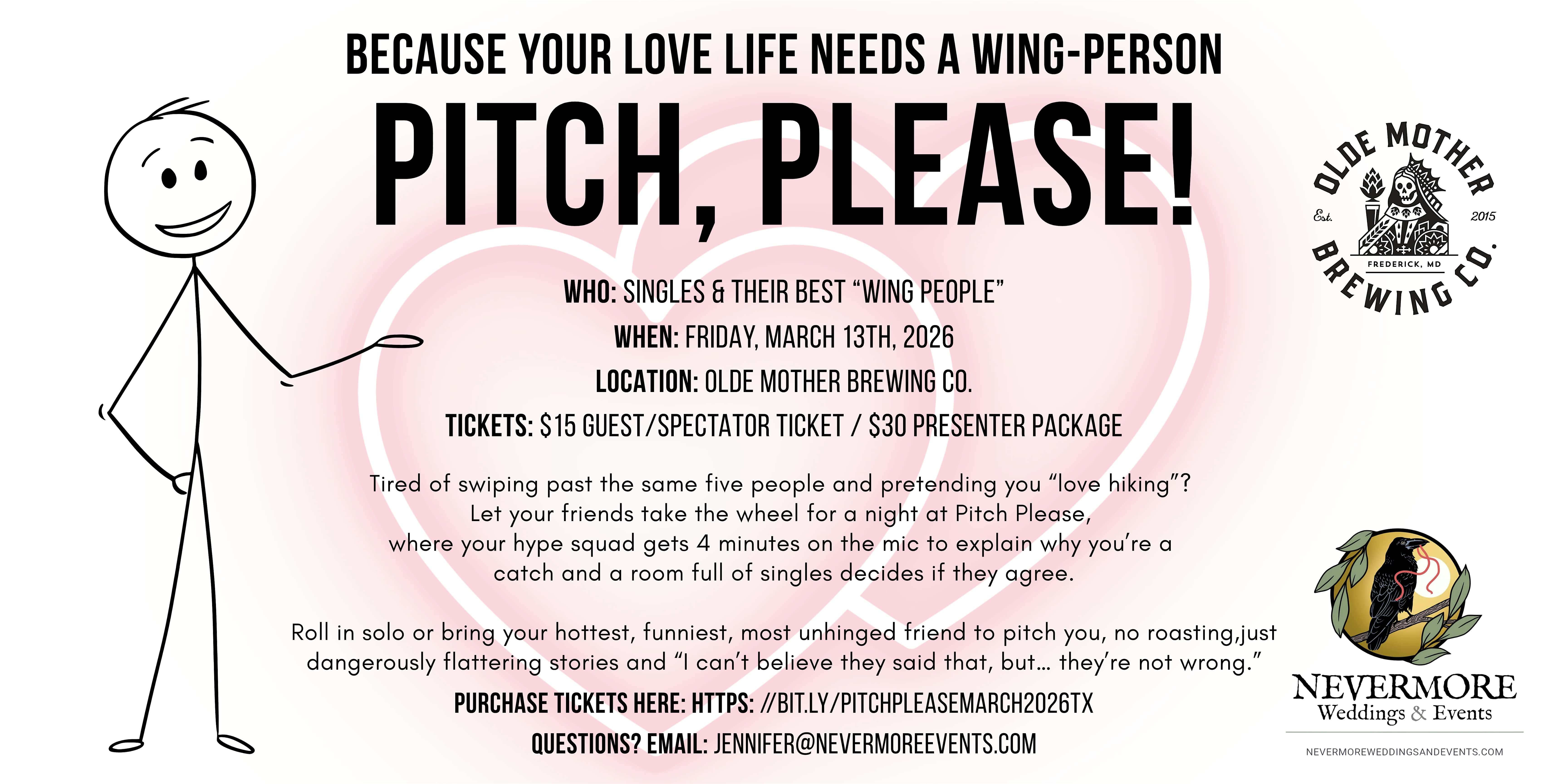 by admin23Feb PITCH, PLEASE! Friends make the best Matchmakers at Olde Mother Brewing – Frederick, MD PITCH, PLEASE! Friends make the best Matchmakers at Olde Mother Brewing – Frederick, MD 2 2 people viewed this event. A singles event where your friends pitch you (and you get to hear why they think you’re amazing) Tickets-RSVP Link Date And Time Friday, March 13th, 2026 06:00 PM (PST) Venue Olde Mother Brewing Location 526 North Market Street, Frederick, MD 21701 Event Types Community & CultureParty or Social Gathering Event Category Maryland Share With Friends Facebook Twitter Linkedin Xing Pinterest Share This Post: