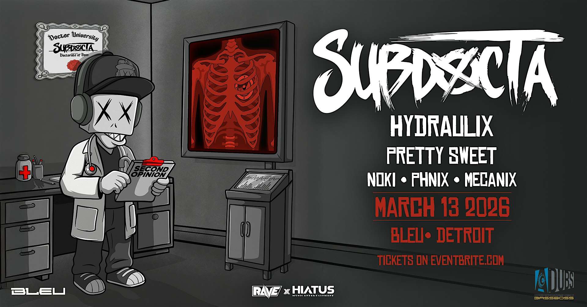 by admin23Feb RAVE X HIATUS PRESENTS: SUBDOCTA SECOND OPINION TOUR at Bleu Detroit – Detroit, MI RAVE X HIATUS PRESENTS: SUBDOCTA SECOND OPINION TOUR at Bleu Detroit – Detroit, MI 1 1 people viewed this event. SUBDOCTA SECOND OPINION TOUR – feat. SubDocta | Hydraulix | Pretty Sweet | Noki | Phnix | Mecanix at Bleu Detroit on March 13th | 8p-2a Tickets-RSVP Link Date And Time Friday, March 13th, 2026 08:00 PM (PST) Venue Bleu Detroit Location 1540 Woodward Avenue, Detroit, MI 48226 Event Types Concert or PerformanceMusic Event Category DetroitMichigan Share With Friends Facebook Twitter Linkedin Xing Pinterest Share This Post: