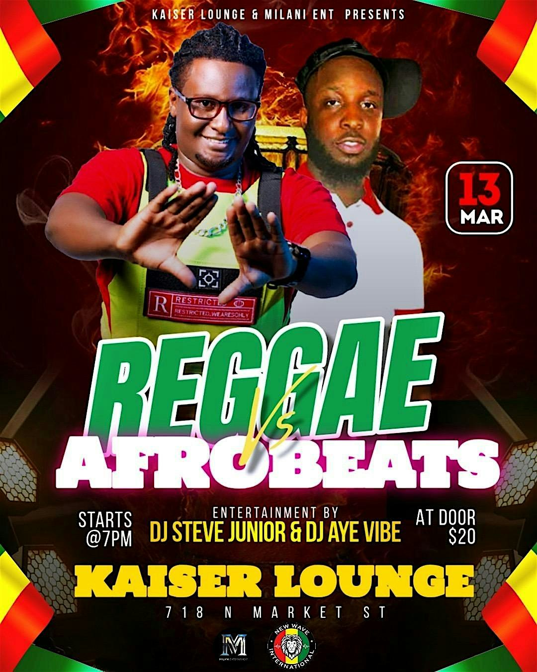 by admin27Feb REGGAE VS AFROBEATS at 718 N Market St – Wilmington, DE REGGAE VS AFROBEATS at 718 N Market St – Wilmington, DE 1 1 people viewed this event. JOIN US MARCH 13TH FOR REGGEA VS AFROBEATS WITH DJ STEVE JR (KENYA) AND DJ AYE VIBE (DE) AT KAISER LOUNGE Tickets-RSVP Link Date And Time Friday, March 13th, 2026 07:00 PM (PST) Venue 718 N Market St Location 718 North Market Street, Wilmington, DE 19801 Event Types Concert or PerformanceMusic Event Category Delaware Share With Friends Facebook Twitter Linkedin Xing Pinterest Share This Post:
