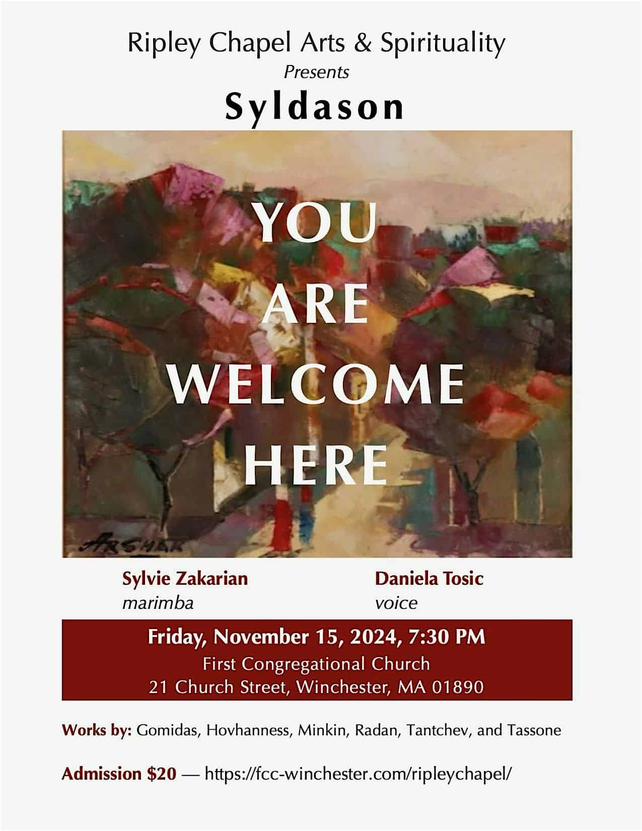 by admin23Feb Ripley Presents: Syldason-You Are Welcome Here at First Congregational Church in Winchester – Winchester, MA Ripley Presents: Syldason-You Are Welcome Here at First Congregational Church in Winchester – Winchester, MA 1 1 people viewed this event. Daniela Tosic (voice) and Sylvie Zakarian (marimba) meld folk and classical traditions to form a new Balkan repertory. Tickets-RSVP Link Date And Time Friday, March 13th, 2026 07:00 PM (PST) Venue First Congregational Church in Winchester Location 21 Church Street, Winchester, MA 1890 Event Types Concert or PerformanceMusic Event Category Massachusetts Share With Friends Facebook Twitter Linkedin Xing Pinterest Share This Post: