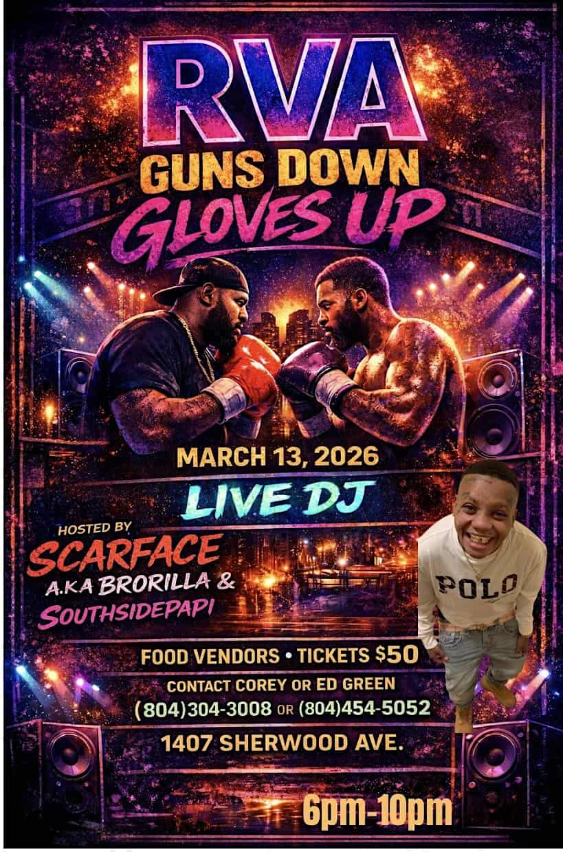 by admin23Feb RVA Guns Down Gloves Up at 1407 Sherwood Avenue, Richmond, VA, USA – Richmond, VA RVA Guns Down Gloves Up at 1407 Sherwood Avenue, Richmond, VA, USA – Richmond, VA 1 1 people viewed this event. RVA Guns Down Gloves Up is a local meetup turning violence into victories with gloves and good vibes. Tickets-RSVP Link Date And Time Friday, March 13th, 2026 @ 06:00 PM Location 1407 Sherwood Avenue, Richmond, VA 23220 Event Types Film, Media & EntertainmentParty or Social Gathering Event Category Virginia Share With Friends Facebook Twitter Linkedin Xing Pinterest Share This Post: