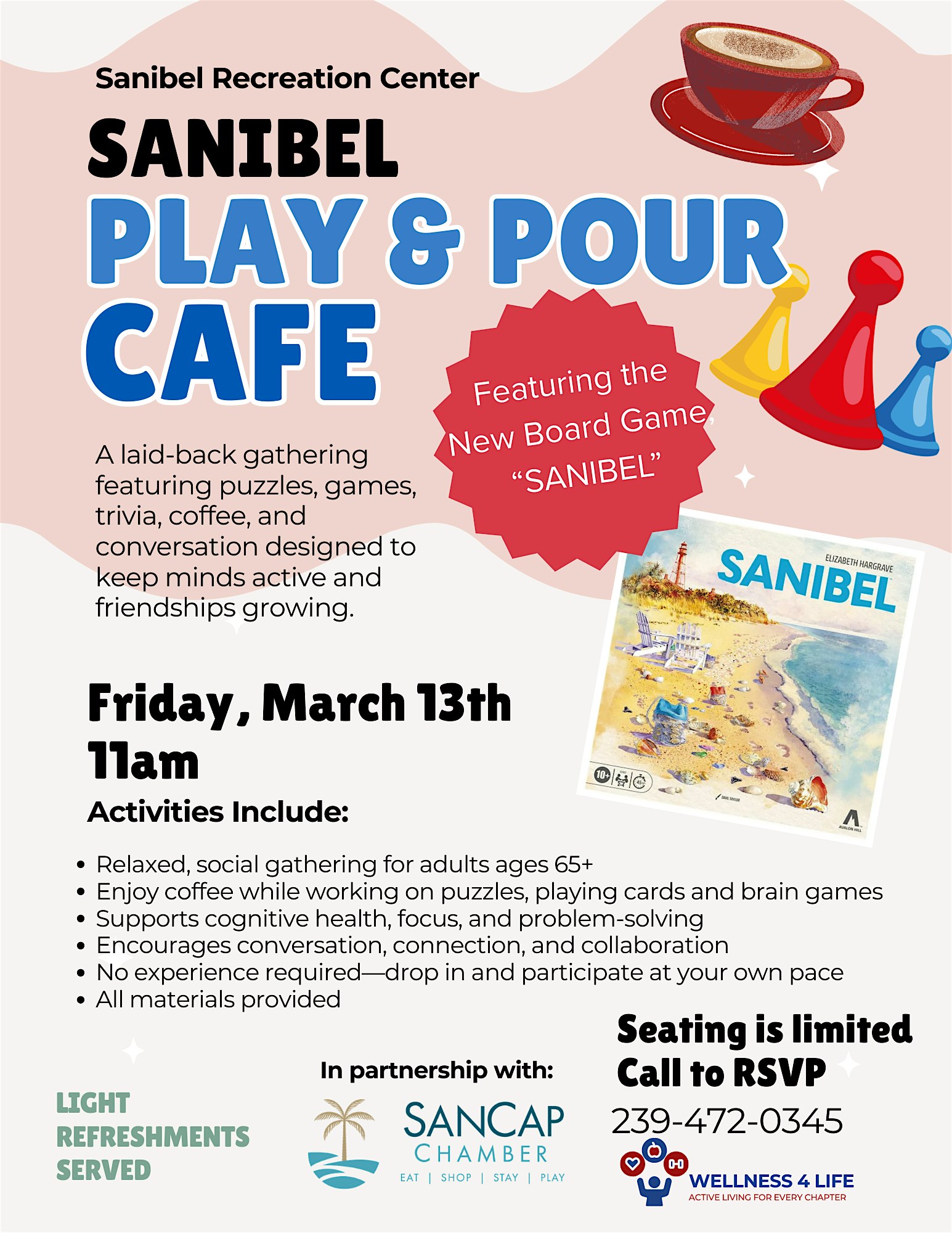 by admin27Feb Sanibel Play and Pour Cafe at 3880 Sanibel Captiva Rd – Sanibel, FL Sanibel Play and Pour Cafe at 3880 Sanibel Captiva Rd – Sanibel, FL 1 1 people viewed this event. Join us at Sanibel Play and Pour Cafe for fun games, great drinks, and good vibes in person! Tickets-RSVP Link Date And Time Friday, March 13th, 2026 @ 11:00 AM Location 3880 Sanibel Captiva Road, Sanibel, FL 33957 Event Types Food & DrinkOther Event Category Florida Share With Friends Facebook Twitter Linkedin Xing Pinterest Share This Post:
