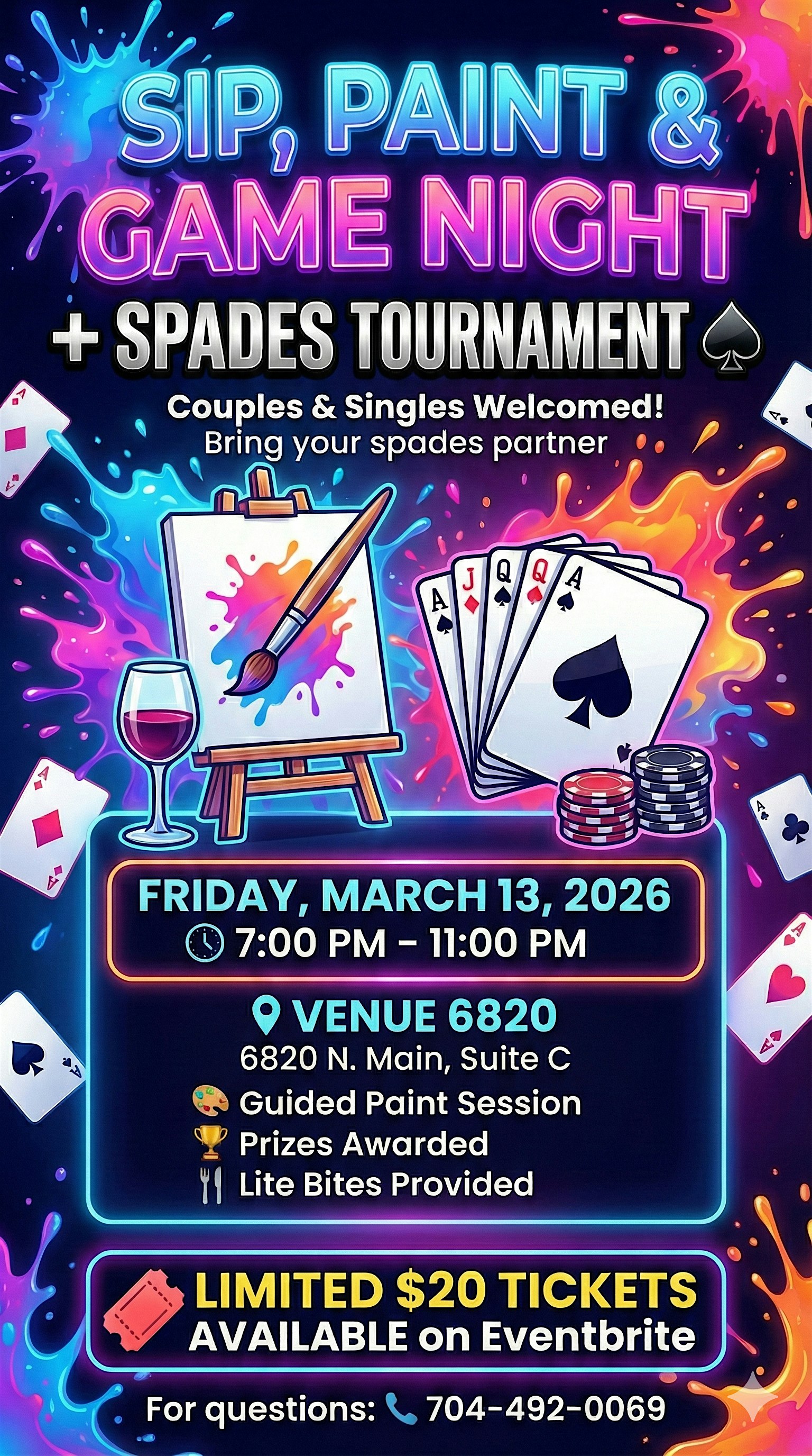 by admin13Feb SIP PAINT and Game night at 6820 N Main St suite b – Columbia, SC SIP PAINT and Game night at 6820 N Main St suite b – Columbia, SC 2 2 people viewed this event. Join us for SIP PAINT and Game Night—fun, drinks, and creativity all in one Who’s the Spades Champ? Prove it on Mar 13! Sip, Paint & Game Tickets-RSVP Link Date And Time Friday, March 13th, 2026 11:00 PM (PST) Venue 6820 N Main St suite b Location 6820 North Main Street, Columbia, SC 29203 Event Types Party or Social GatheringPerforming & Visual Arts Event Category South Carolina Share With Friends Facebook Twitter Linkedin Xing Pinterest Share This Post: