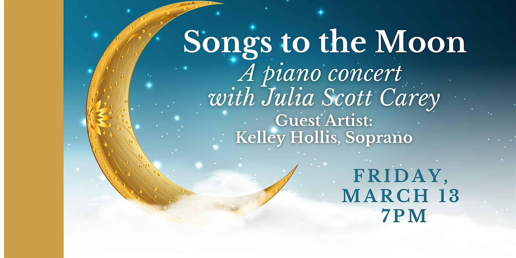 by admin23Feb Songs to the Moon at Central Square Congregational – Bridgewater, MA Songs to the Moon at Central Square Congregational – Bridgewater, MA 2 2 people viewed this event. A piano concert with renowned musicians Julia Scott Carey on piano, and soprano Kelley Hollis. Tickets-RSVP Link Date And Time Friday, March 13th, 2026 07:00 PM (PST) Venue Central Square Congregational Location 71 Central Square, Bridgewater, MA 2324 Event Types Concert or PerformanceMusic Event Category Massachusetts Share With Friends Facebook Twitter Linkedin Xing Pinterest Share This Post: