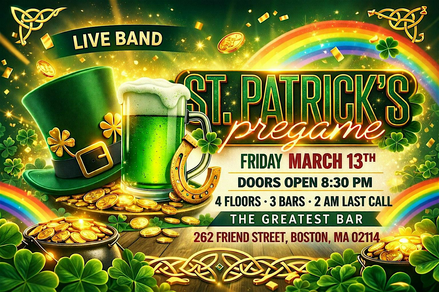 by admin05Mar ST. PADDY’S DAY PREGAME AT THE GREATEST BAR at The Greatest Bar – Boston, MA ST. PADDY’S DAY PREGAME AT THE GREATEST BAR at The Greatest Bar – Boston, MA 2 2 people viewed this event. The night before the crawl—start the weekend off right at Boston’s only FOUR-floor bar! The Greatest Bar — Friday March 13th until 2AM Tickets-RSVP Link Date And Time Friday, March 13th, 2026 08:00 PM (PST) Venue The Greatest Bar Location 262 Friend Street, Boston, MA 2114 Event Types Party or Social GatheringSeasonal & Holiday Event Category BostonMassachusetts Share With Friends Facebook Twitter Linkedin Xing Pinterest Share This Post:
