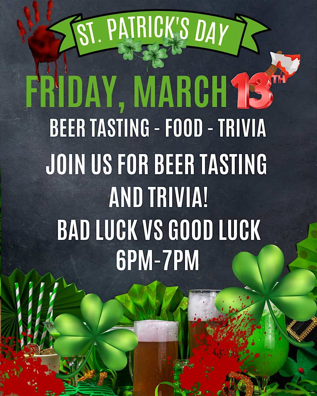 by admin23Feb St Patrick’s Beer Tasting; Bad Luck vs Good Luck at Blytheville Book Company – Blytheville, AR St Patrick’s Beer Tasting; Bad Luck vs Good Luck at Blytheville Book Company – Blytheville, AR 1 1 people viewed this event. Join us for a fun evening of beer tasting, snacks, and trivia! Bad luck vs Good luck! Tickets-RSVP Link Date And Time Friday, March 13th, 2026 06:00 PM (PST) Venue Blytheville Book Company Location 429 W Main Street, Blytheville, AR 72315 Event Types Food & DrinkParty or Social Gathering Event Category Arkansas Share With Friends Facebook Twitter Linkedin Xing Pinterest Share This Post: