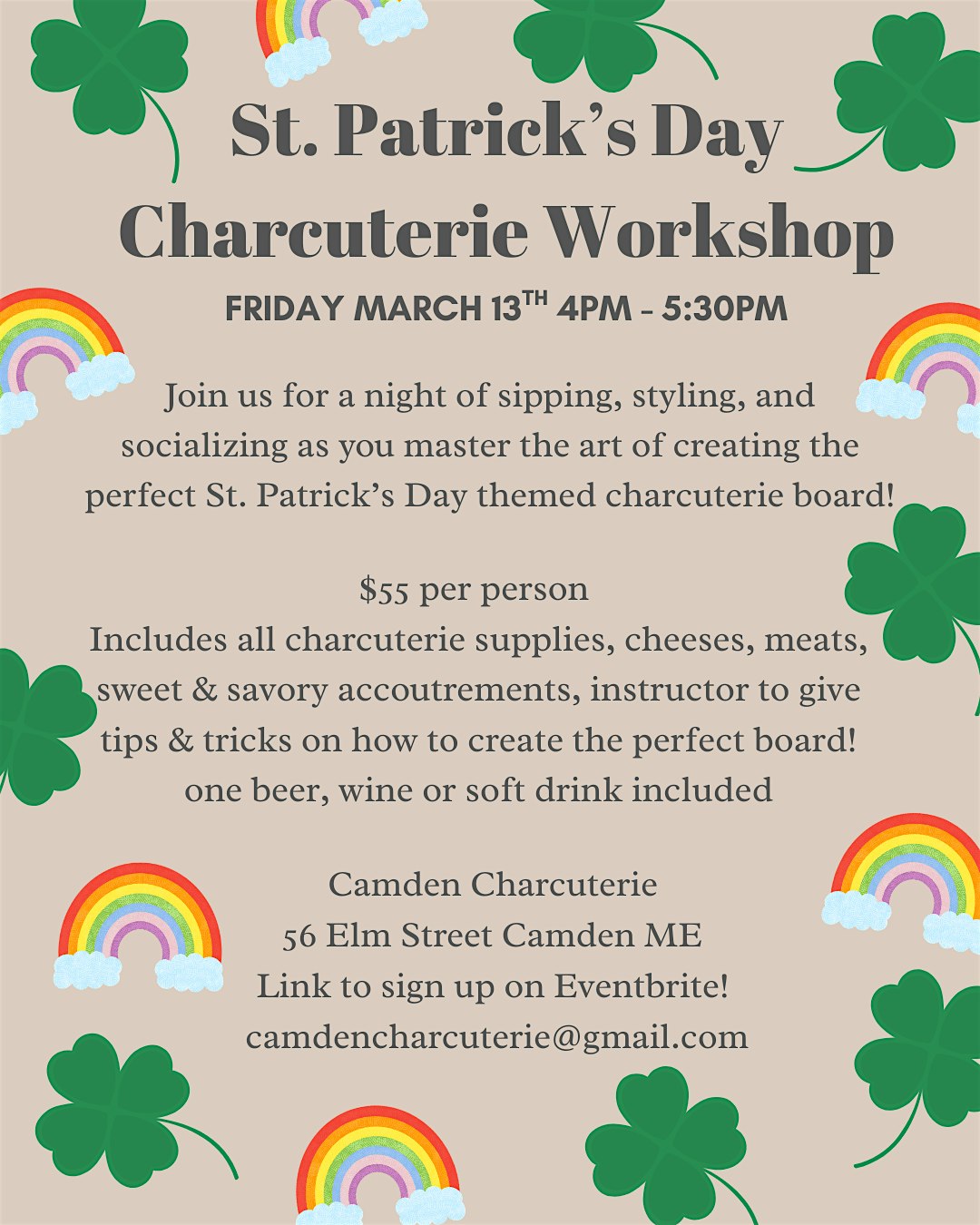 by admin27Feb St Patrick’s Day Charcuterie Workshop at Camden Charcuterie – Camden, ME St Patrick’s Day Charcuterie Workshop at Camden Charcuterie – Camden, ME 1 1 people viewed this event. Create your own St Patrick’s Day themed Charcuterie Board! All supplies included! Tickets-RSVP Link Date And Time Friday, March 13th, 2026 @ 04:00 PM Location 56 Elm Street, Camden, ME 4843 Event Types Food & Drink Event Category Maine Share With Friends Facebook Twitter Linkedin Xing Pinterest Share This Post: