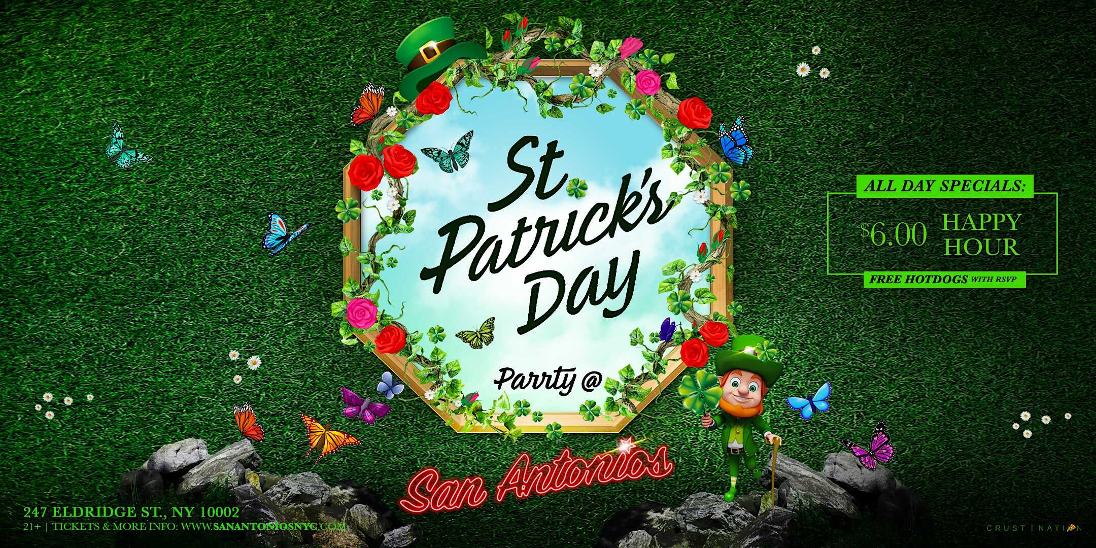 by admin23Feb St Patrick’s Day Weekend @ San Antonios Lower East Side at San Antonios – New York, NY St Patrick’s Day Weekend @ San Antonios Lower East Side at San Antonios – New York, NY 3 3 people viewed this event. New Series in the spirit of St. Patrick’s Day! Tickets-RSVP Link Date And Time Friday, March 13th, 2026 05:00 PM (PST) Venue San Antonios Location 247 Eldridge Street, New York, NY 10002 Event Types MusicParty or Social Gathering Event Category New YorkNew York City Share With Friends Facebook Twitter Linkedin Xing Pinterest Share This Post: