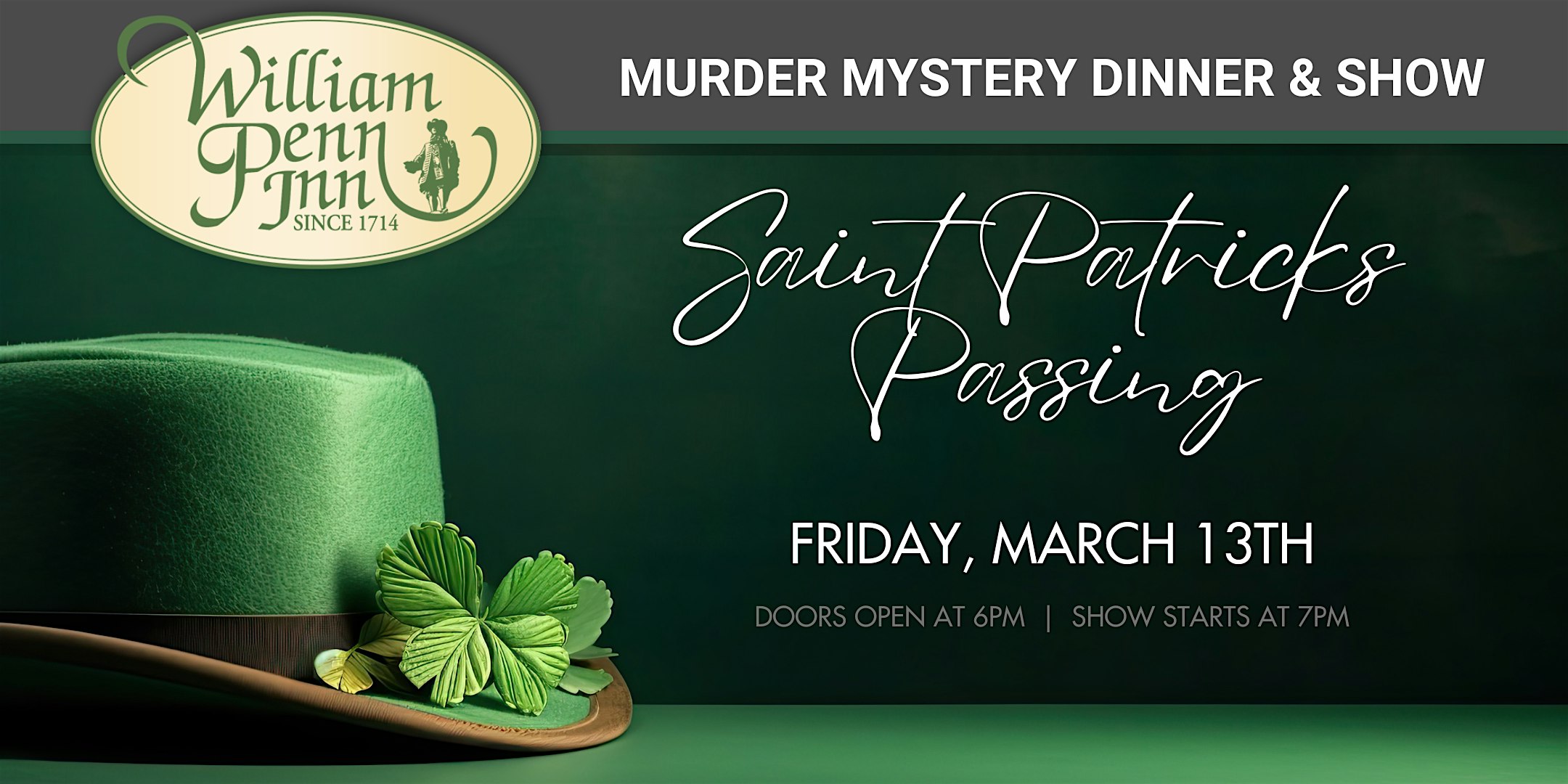 by admin23Feb St. Patrick’s Passing! Murder Mystery Dinner at the William Penn Inn!! at William Penn Inn – Gwynedd, PA St. Patrick’s Passing! Murder Mystery Dinner at the William Penn Inn!! at William Penn Inn – Gwynedd, PA 2 2 people viewed this event. Rival floats turn ruthless before St. Patrick’s parade when a handyman vanishes—uncover the truth behind second-place glory. Tickets-RSVP Link Date And Time Friday, March 13th, 2026 06:00 PM (PST) Venue William Penn Inn Location 1017 Dekalb Pike, Gwynedd, PA 19436 Event Types Food & Drink Event Category Pennsylvania Share With Friends Facebook Twitter Linkedin Xing Pinterest Share This Post: